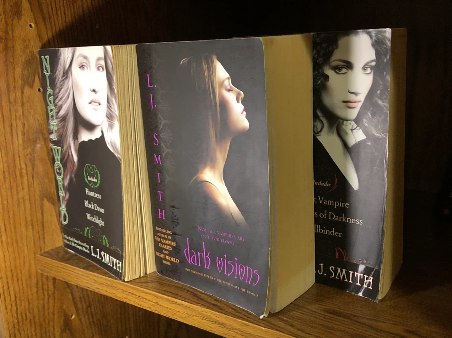 Three L.J. Smith Night World volumes, each housing three stories from the Night World universe. Also included is “Dark Visions”, which also holds three stories and is by L.J. Smith.