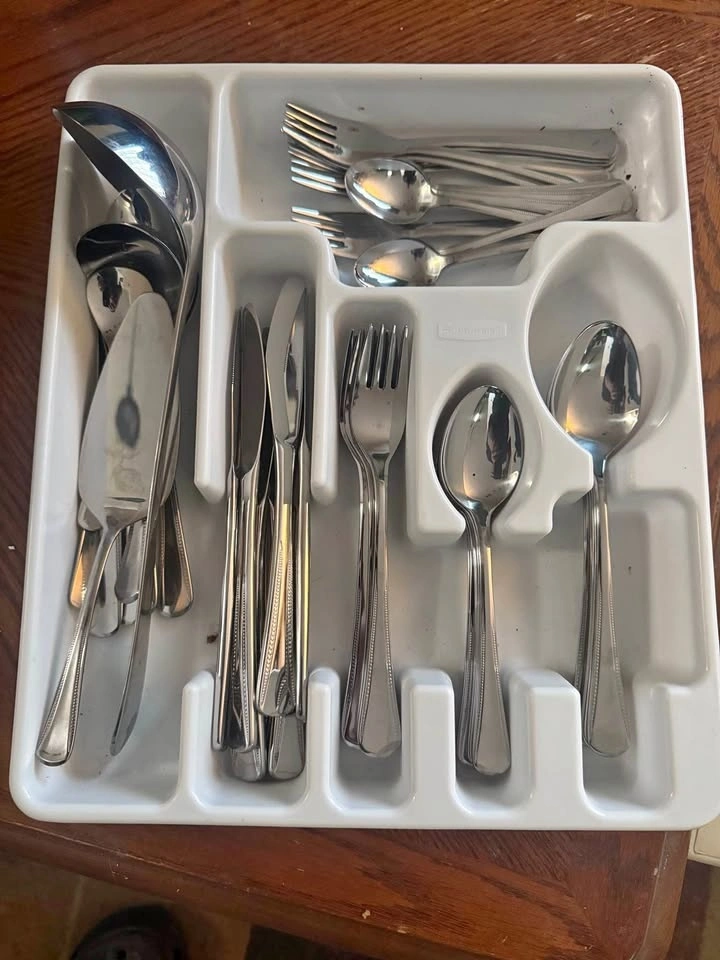 Amefa stainless steel cutlery set for 8 place settings (48 pieces plus 9 piece serving set) for a total of 57 pieces. This brand originates from Holland and is well-regarded for its durability, ergonomic design, and value. Reliable, rust-resistant, and suitable for both daily use and special occasions.
