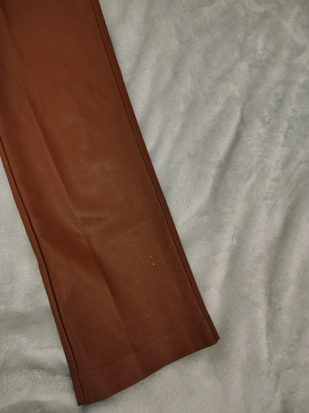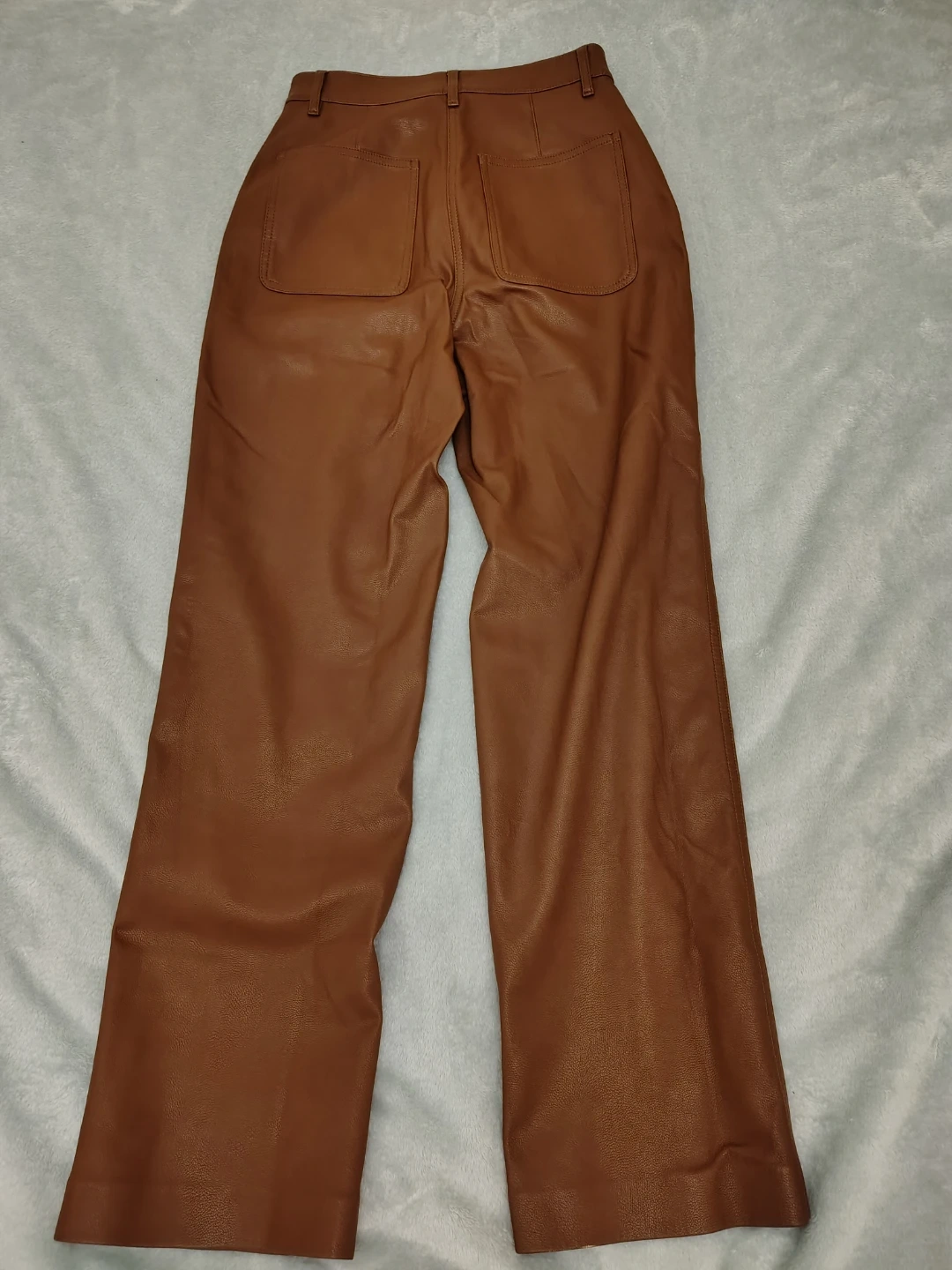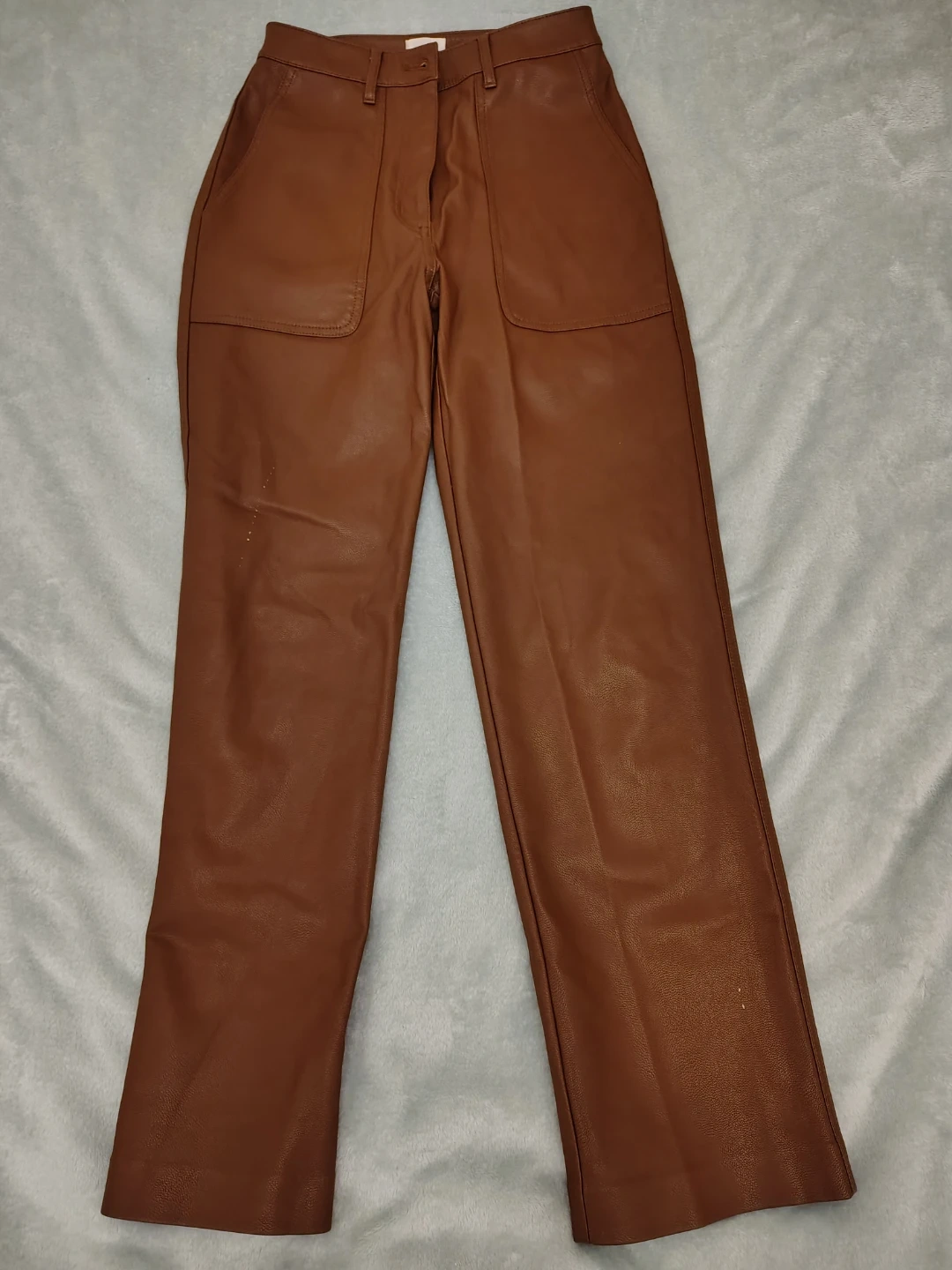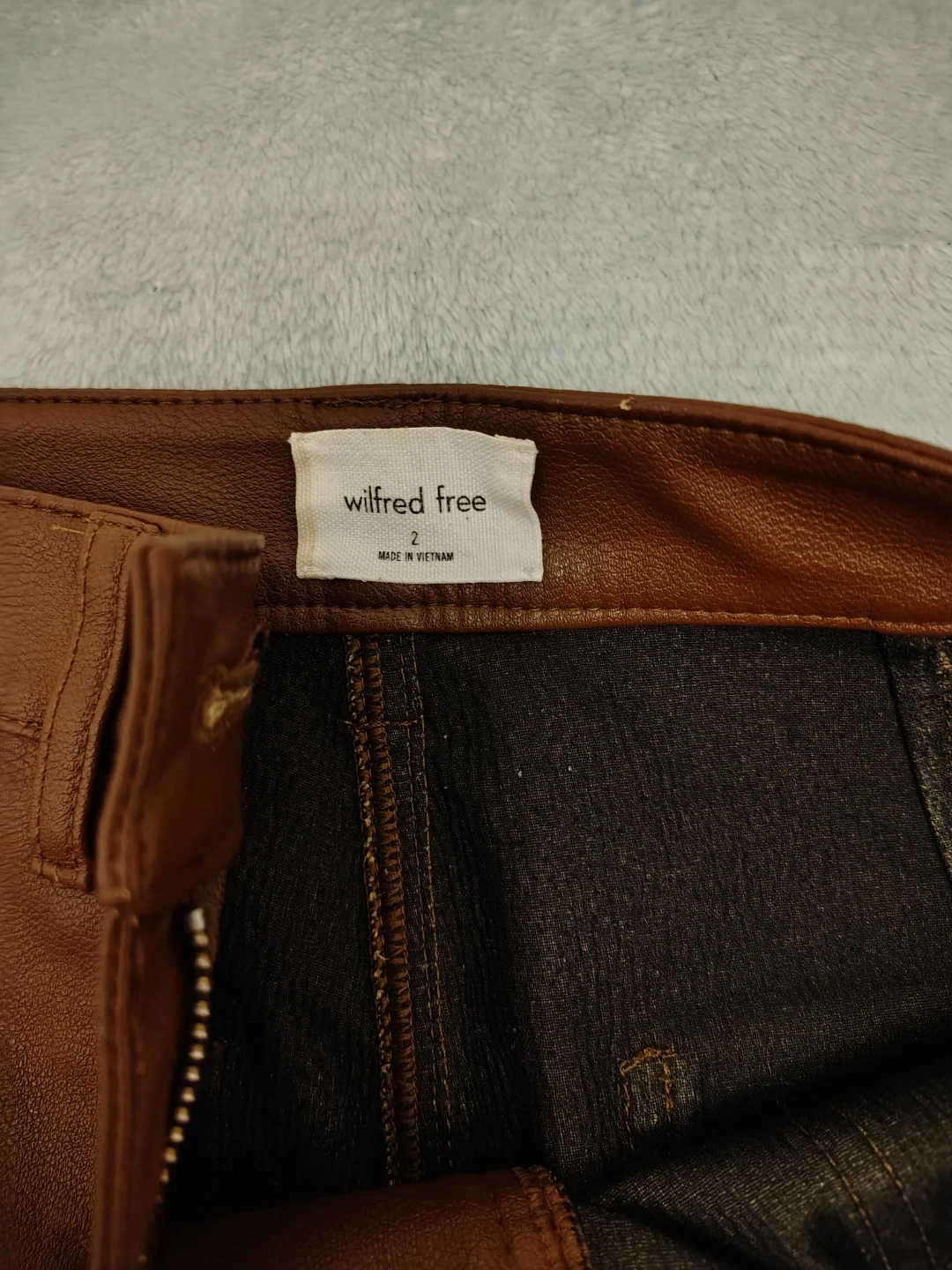 These Wilfred Free pants are a stylish brown faux leather. They're a size 2, made in Vietnam. These pants feature a classic design with a button and zip closure. Faux leather material. Very small markup areas from my puppies claws, barely noticeable.