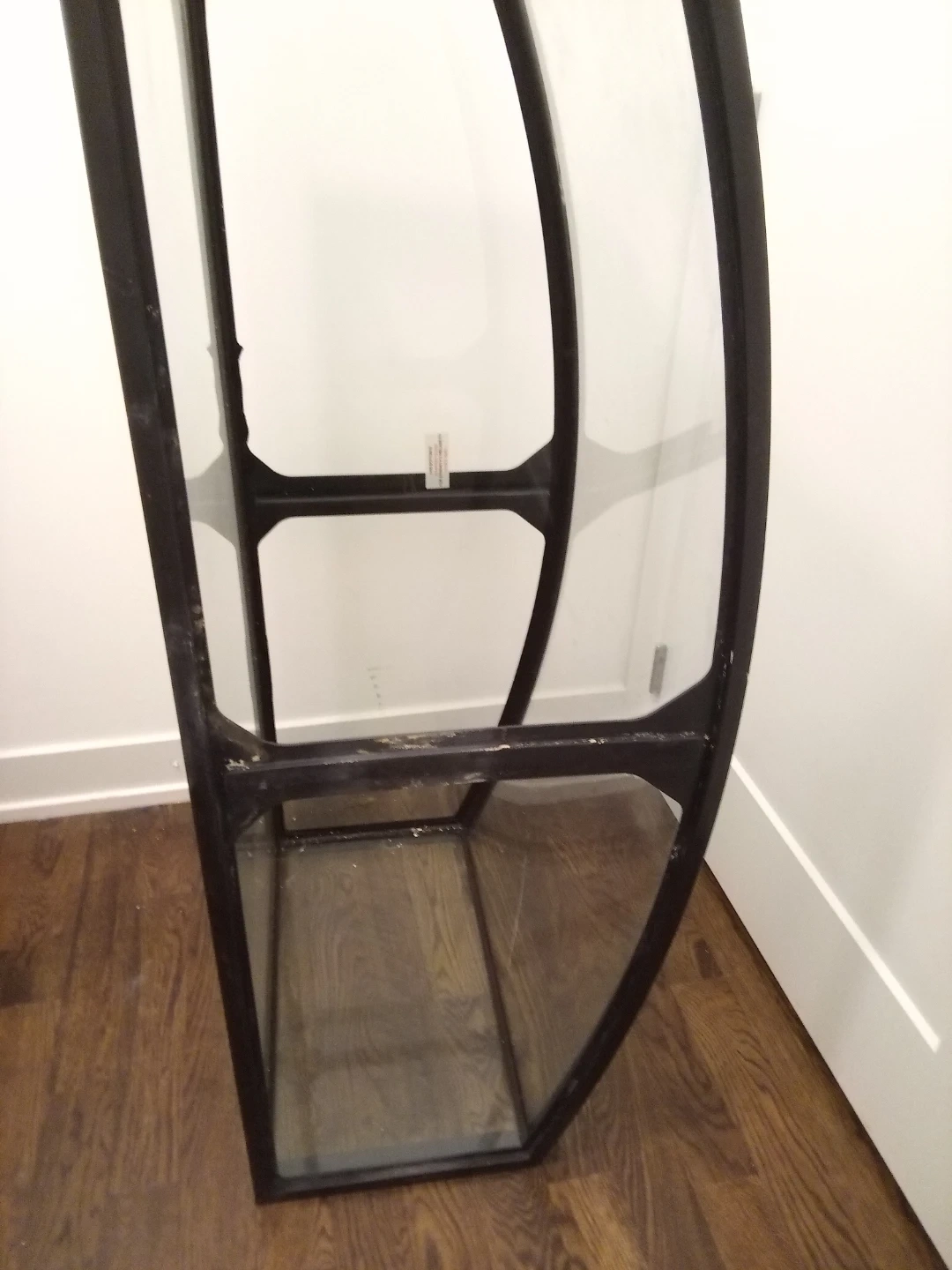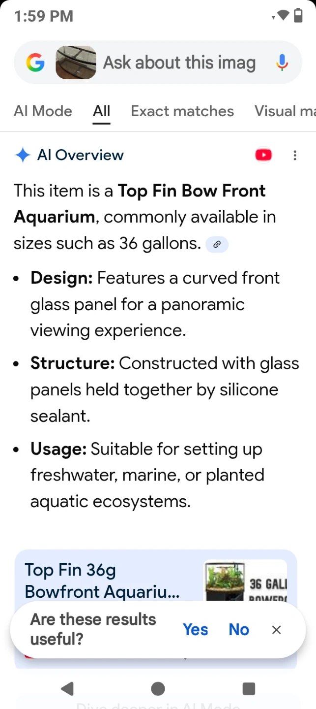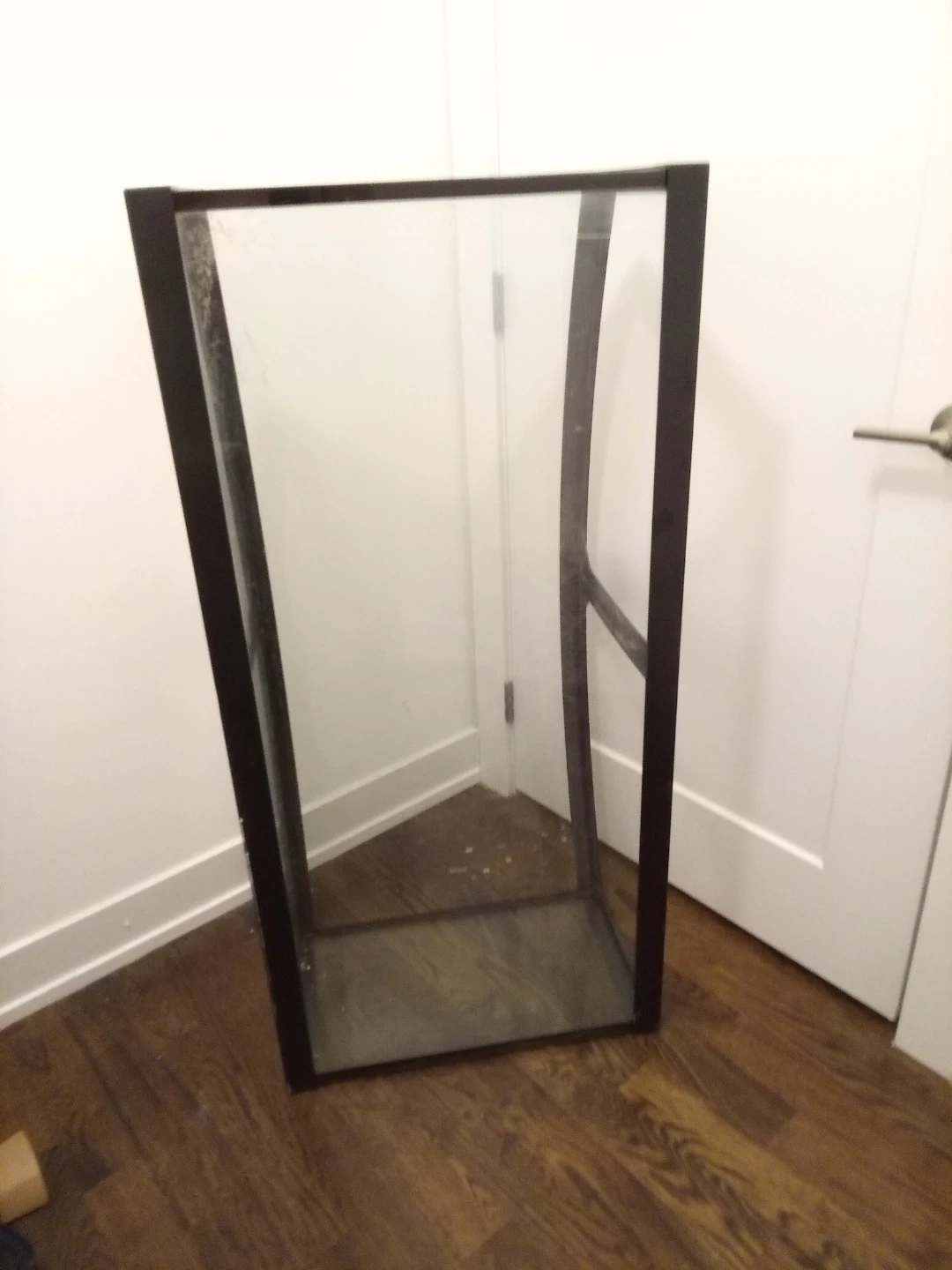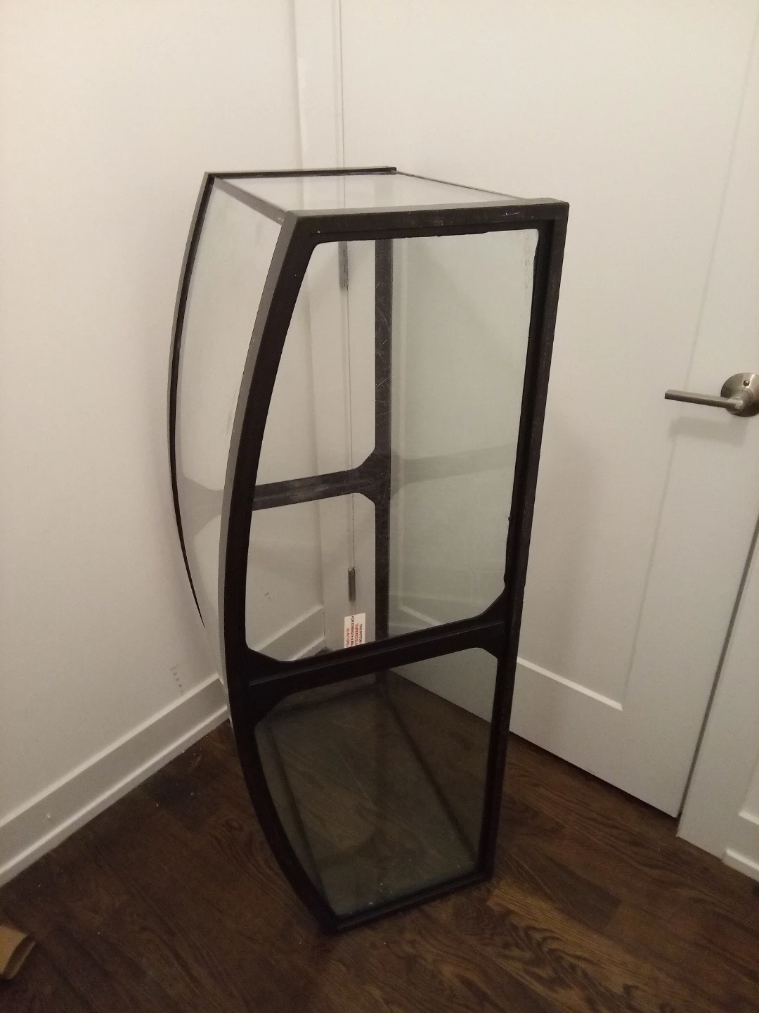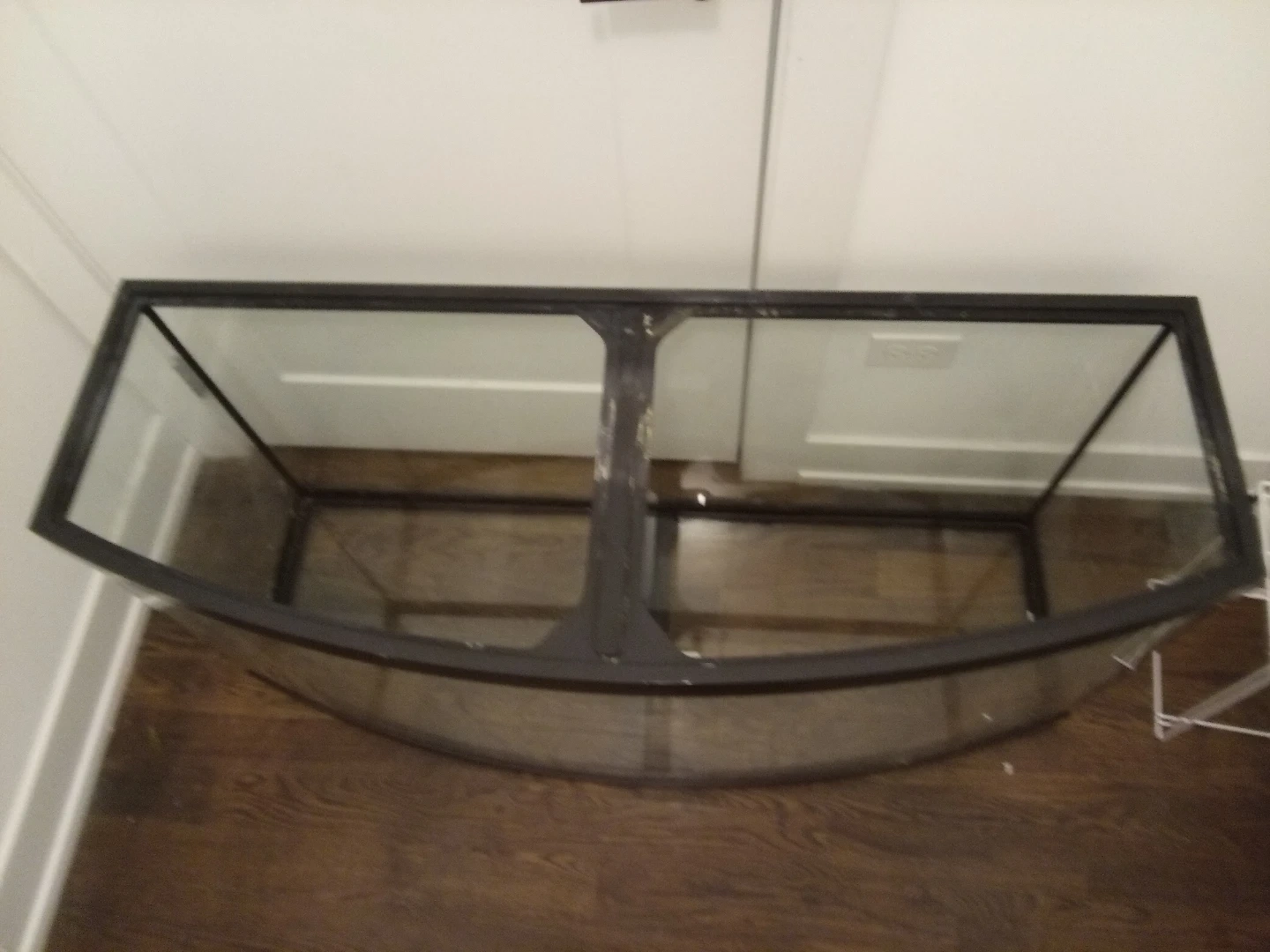 This is a large bowfront aquarium tank. It's made of glass with a black frame. The bowfront design offers a wide viewing area for your aquatic pets. 49"W x 23"H x19" deep