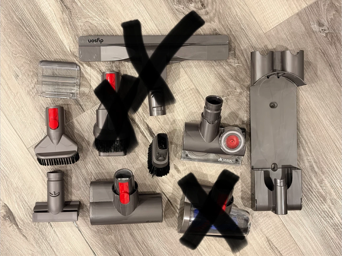 Selling a set of Dyson vacuum cleaner attachments. Includes various brush heads and extensions for different cleaning needs. All pieces are grey and made of durable plastic.