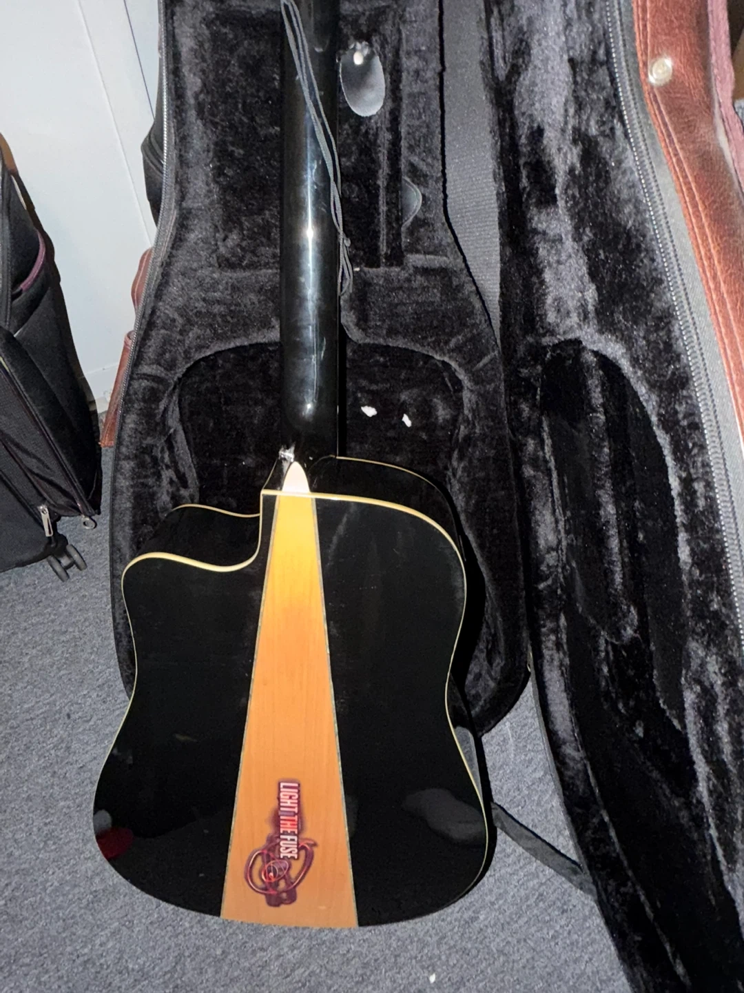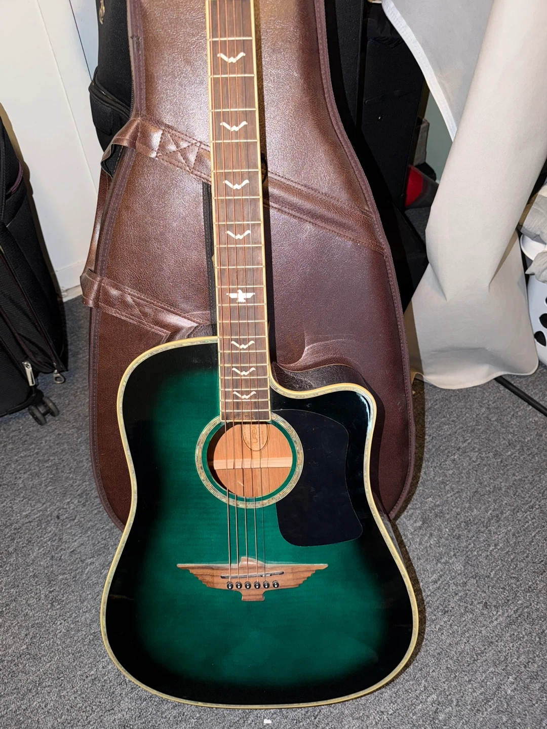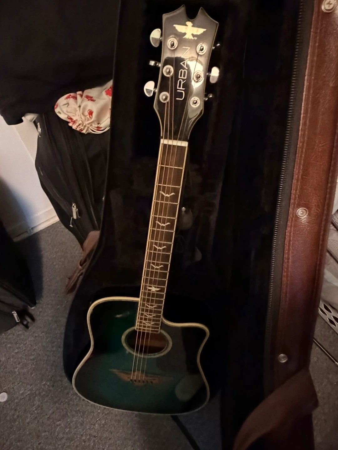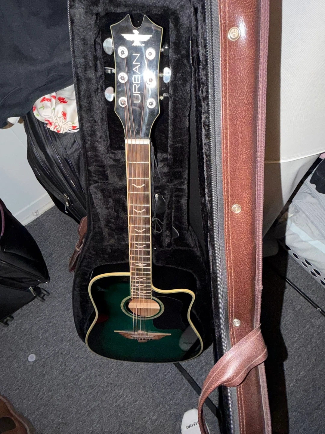 This is an Urban acoustic electric guitar. It features a sunburst green finish and comes with a brown hard shell case. It has a pickup for amplification. Great for guitarists of all levels!