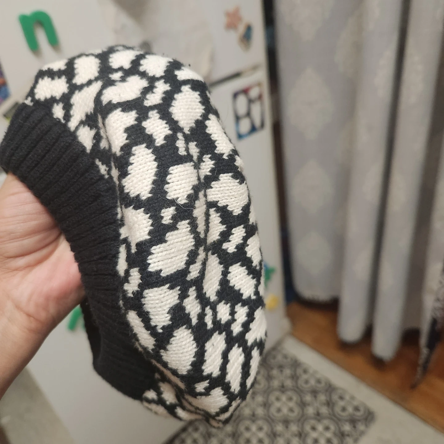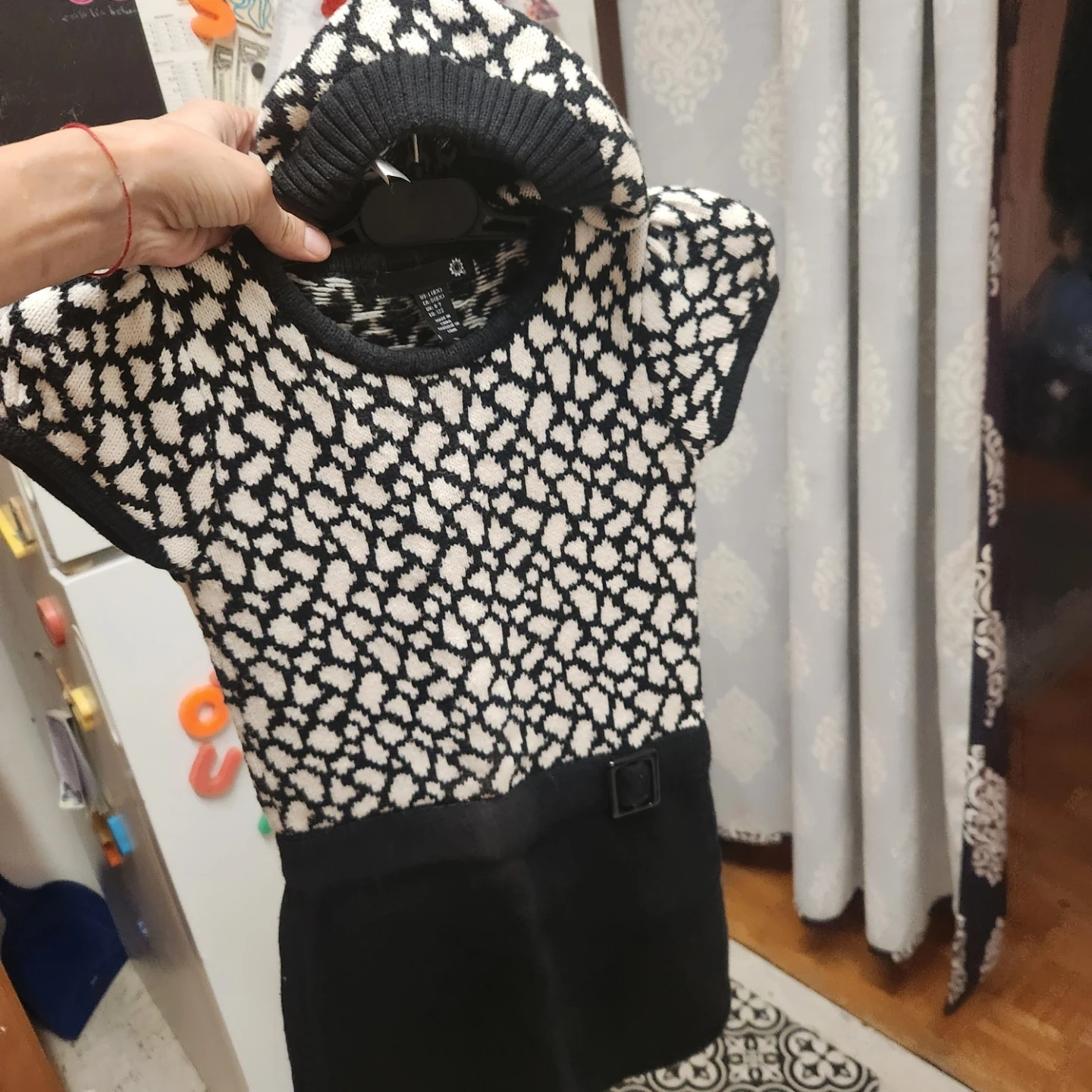 This is a knitted sweater dress with a black and white abstract pattern. It features short sleeves and a black ribbed collar and waistband with a small black buckle detail.
