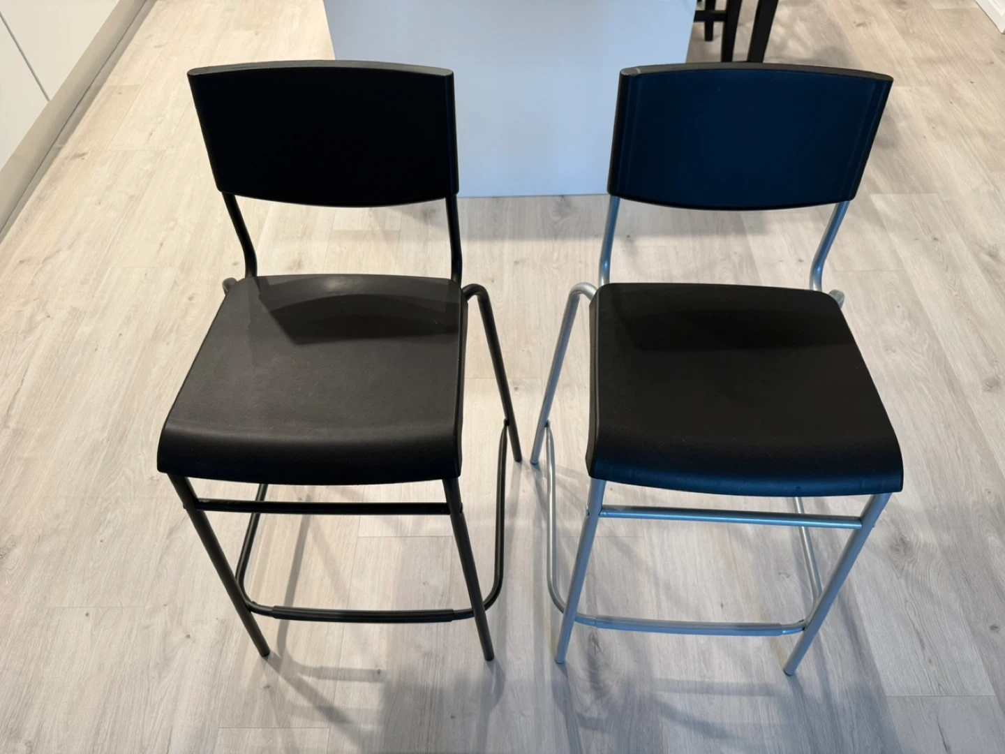 Selling a set of two black bar stools. Each stool features a molded plastic seat and backrest. The frames are made of metal, with one being black and the other silver-toned. These stools are designed for counter height use.