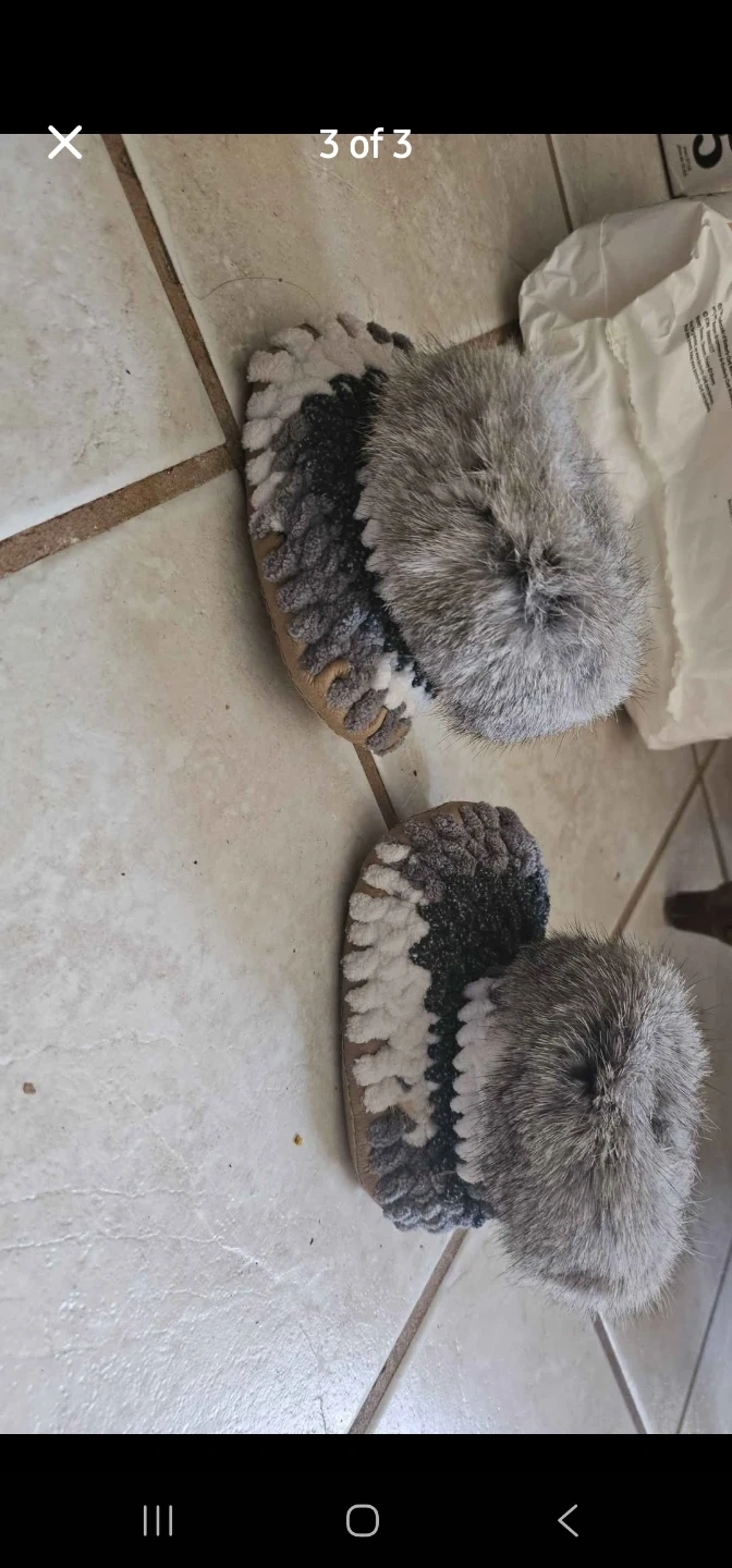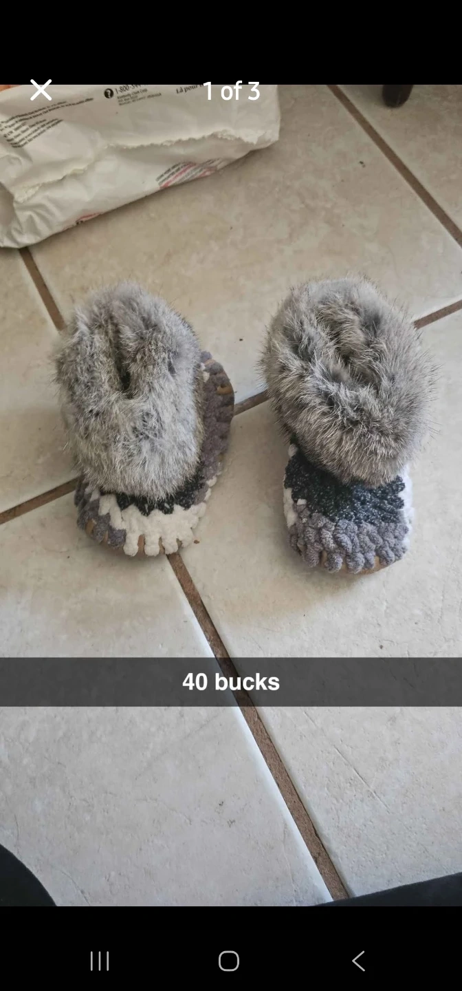 Adorable, handmade crocheted baby boots featuring cozy fur pompoms. The boots have a grey, white, and black striped crochet pattern. They're soft and perfect for keeping little feet warm.