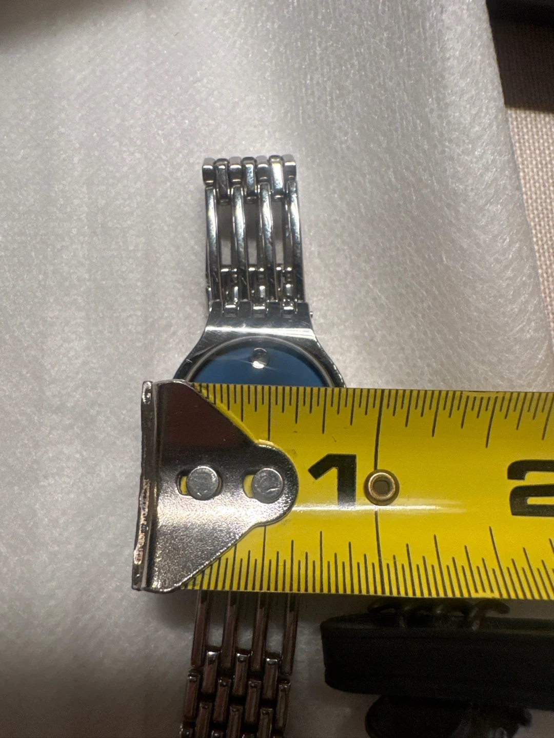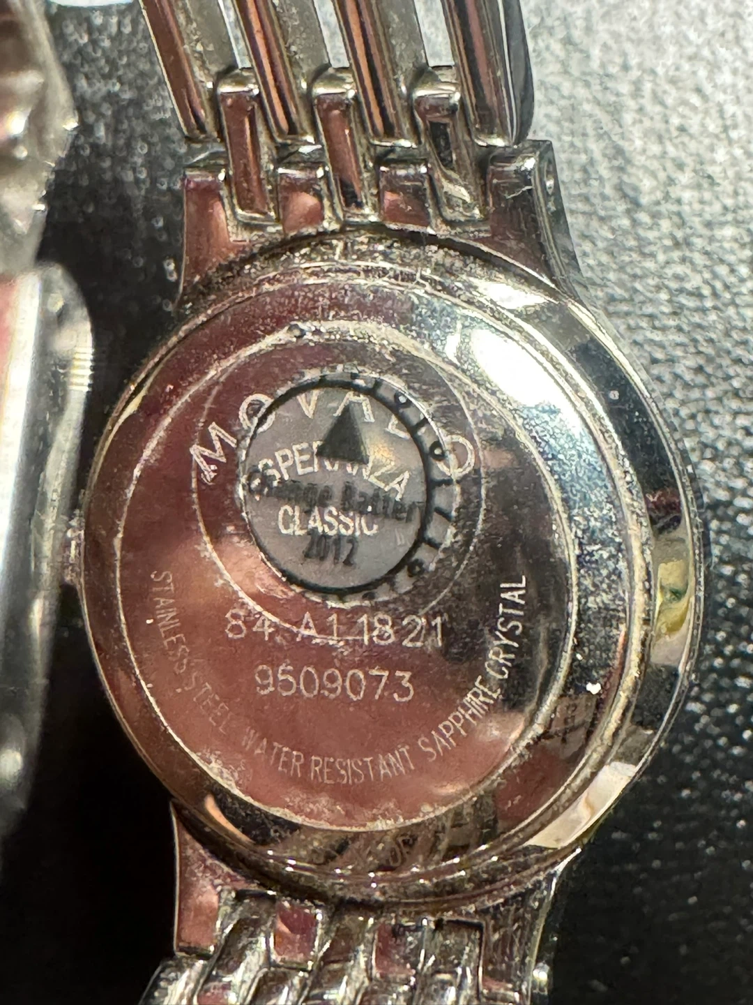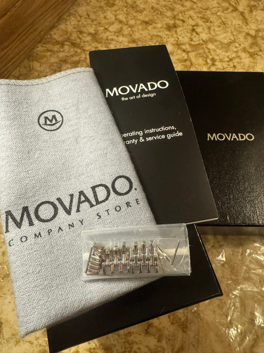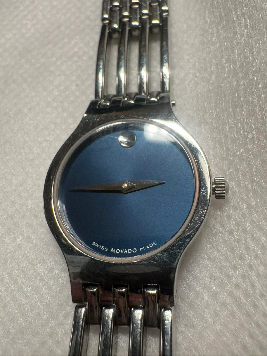Movado Esperanza watch with a stainless steel band and blue dial. It's water-resistant with a sapphire crystal. Includes original box, operating instructions, and extra links.