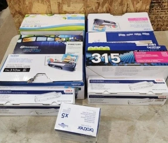Includes a Brother TN-310BK black toner cartridge and a Brother TN315M magenta toner cartridge. Also includes a "Tuzion" toner cartridge and an OKI toner cartridge. These are new items in their original packaging.