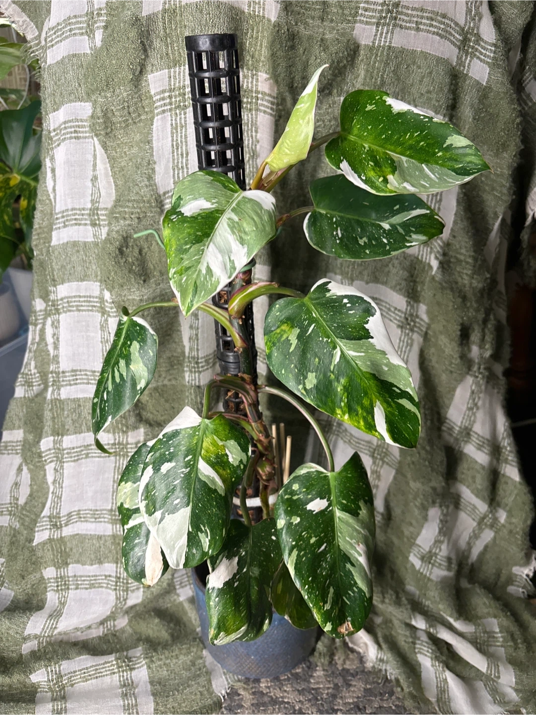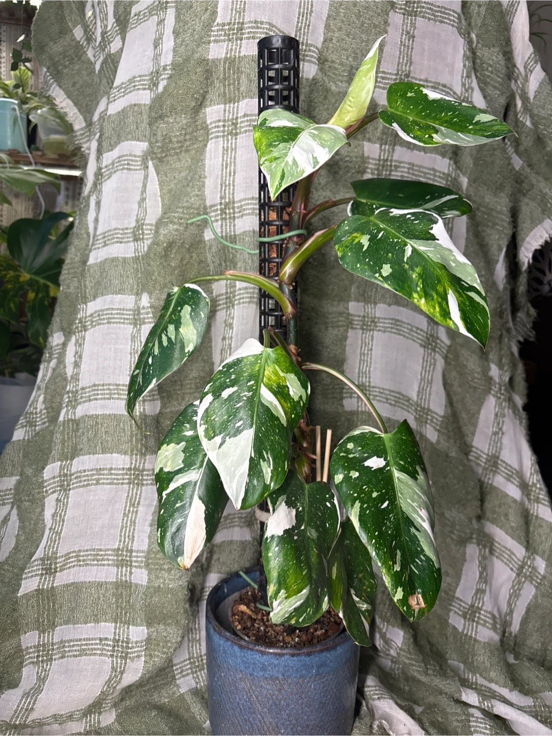 Healthy Philodendron White Princess in a blue pot. It features striking white and green variegated leaves. This plant is supported by a moss pole for upright growth.