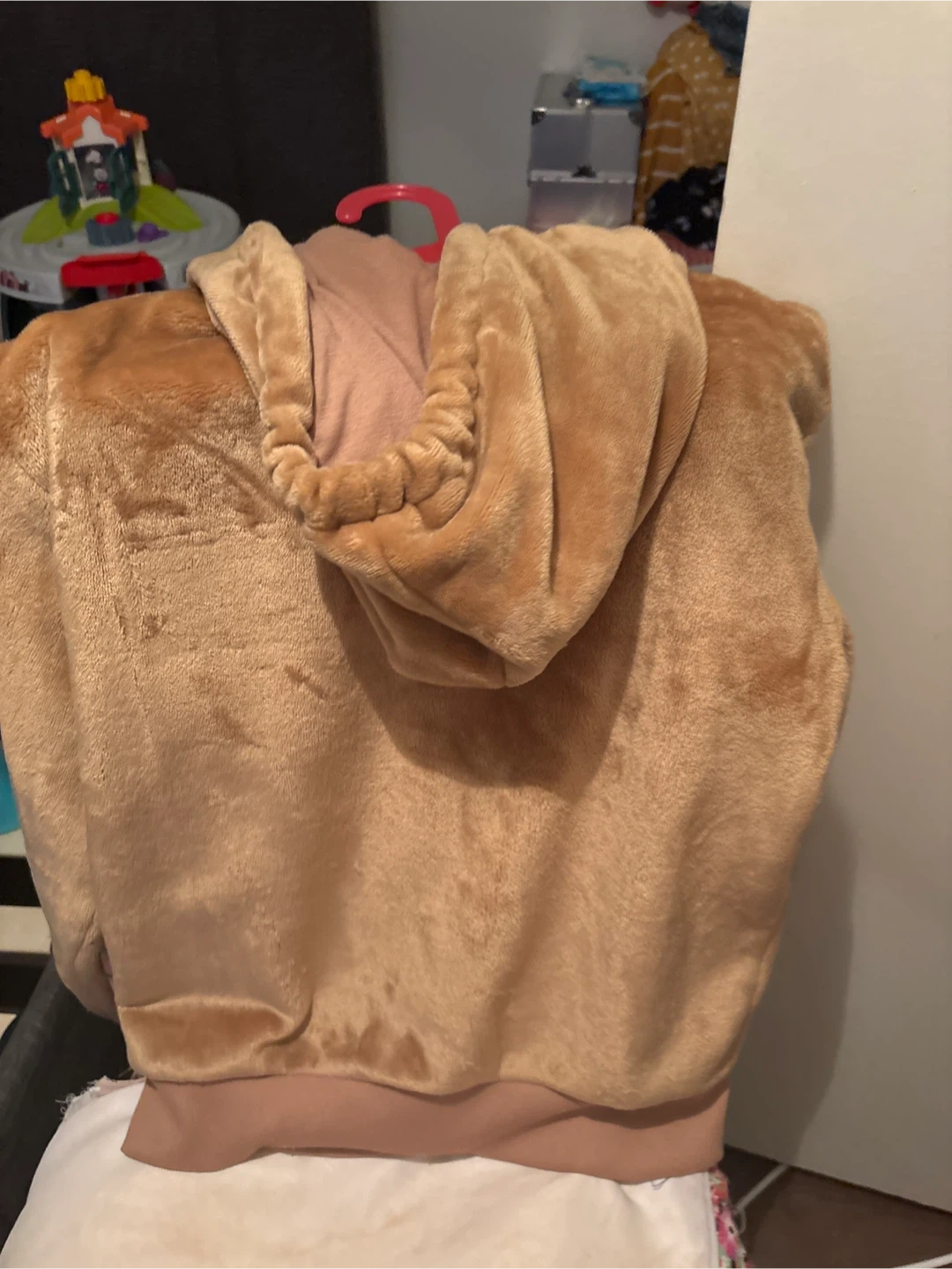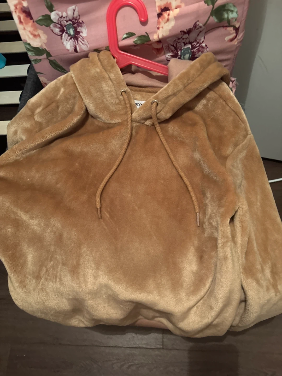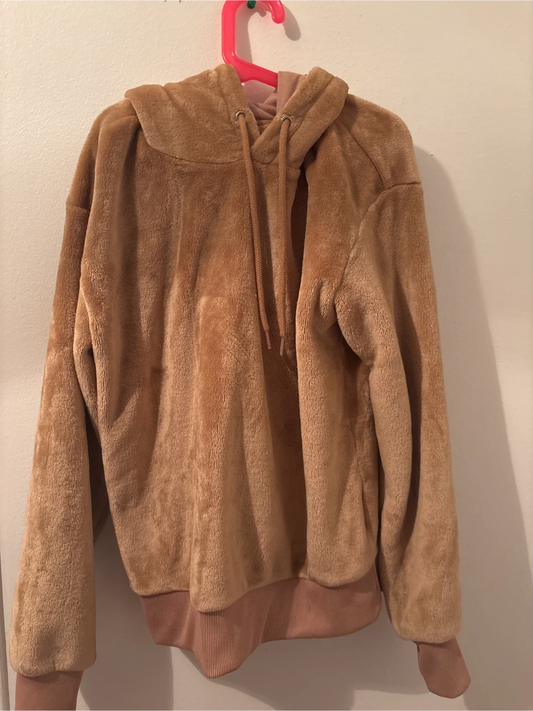 Cozy tan fleece hoodie with a soft texture. It has a drawstring hood and ribbed cuffs and hem. This comfy hoodie is great for lounging or casual outings!