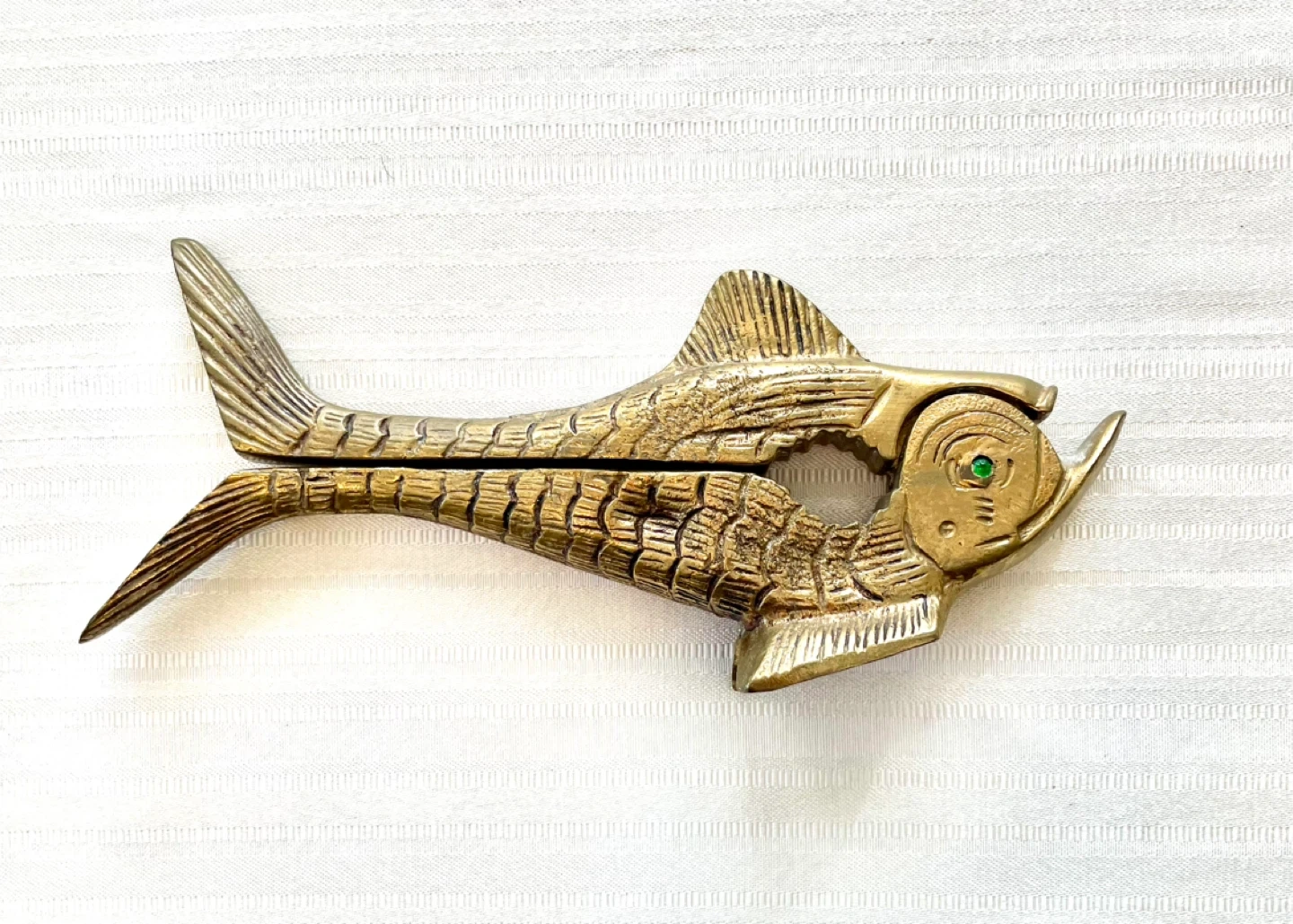 Vintage golden solid brass metal nutcracker zoomorphic fish with detailed scales and green eyes.