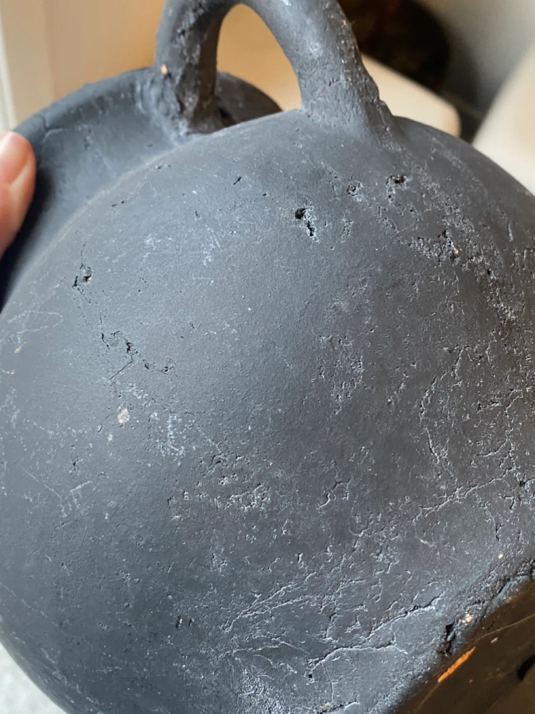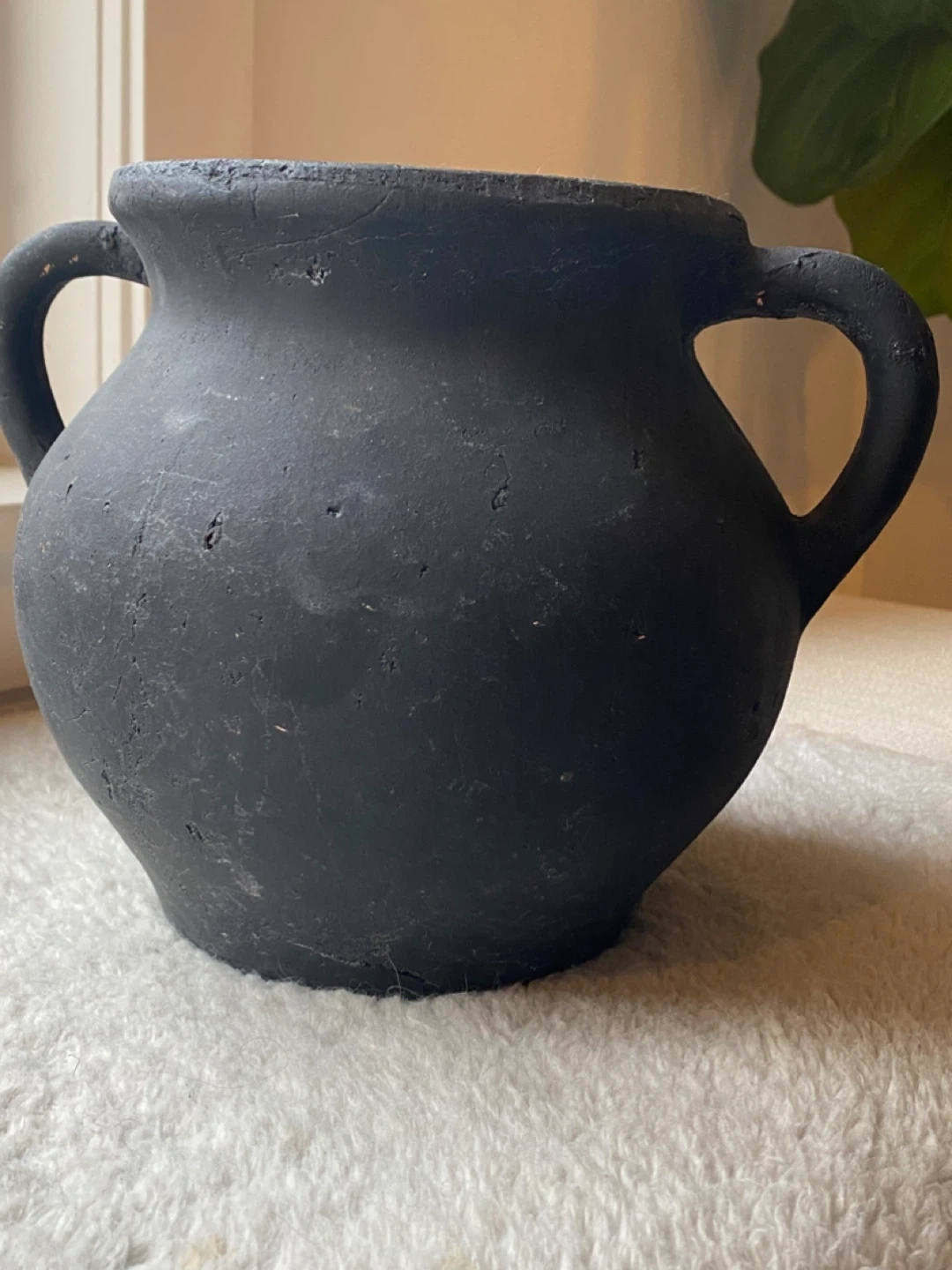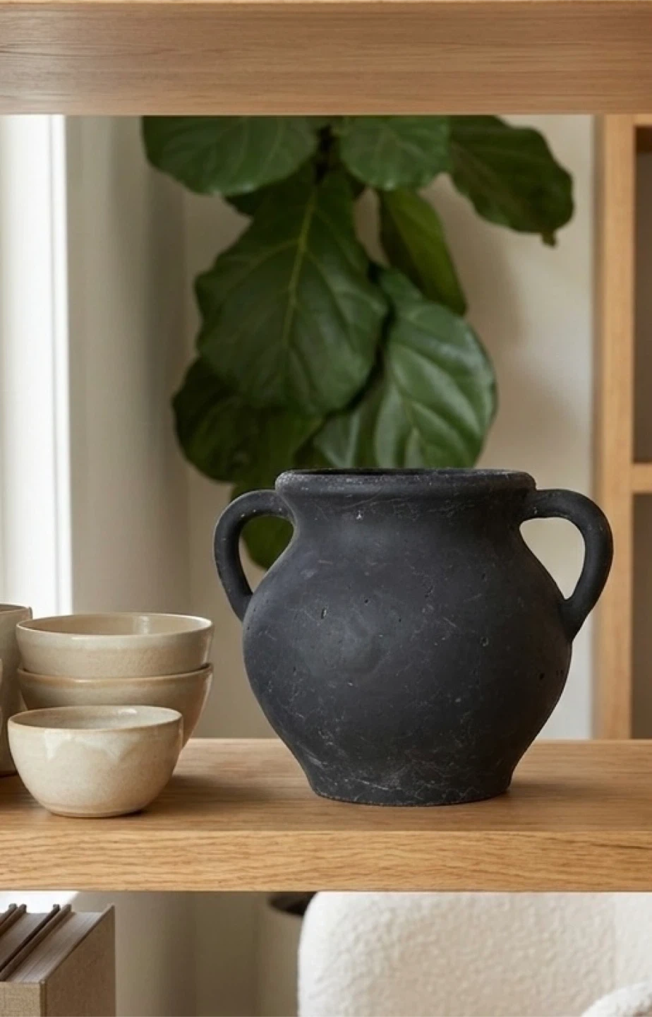 A decorative matte black ceramic vase with two handles. Its textured ceramic finish gives it a rustic charm. It's perfect for adding a touch of natural decor to any shelf or tabletop.
