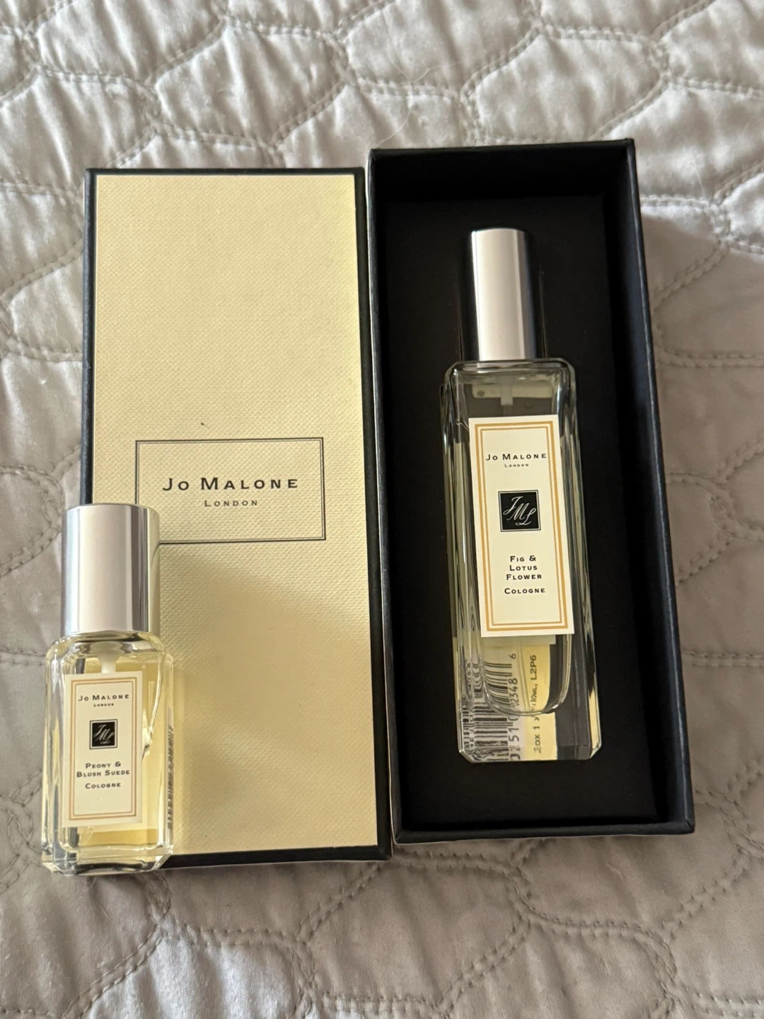 Two Jo Malone London colognes are included: Peony & Blush Suede and Fig & Lotus Flower.