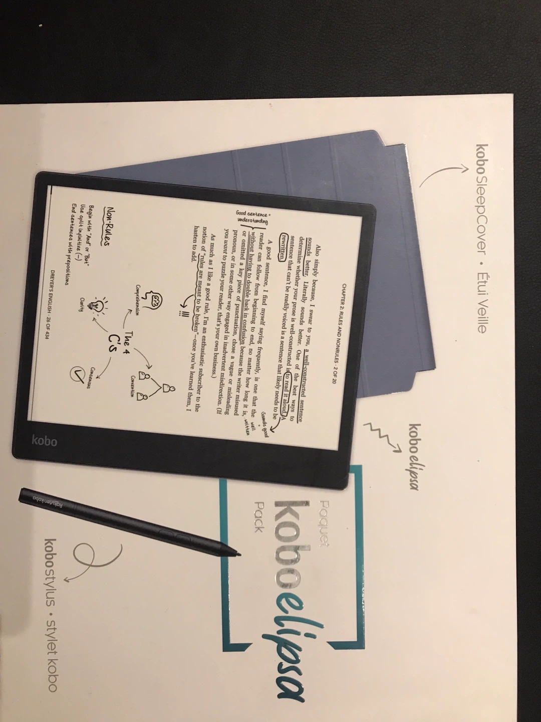 Kobo eReader needs charging. Comes with a blue case. Good for reading.