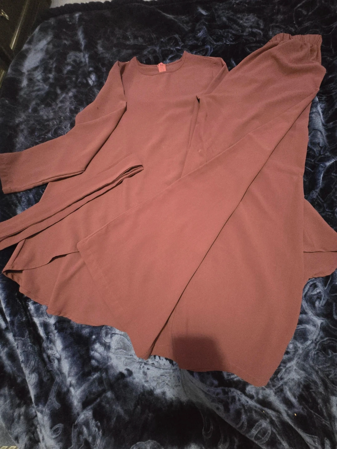 Two-piece dusty rose outfit. Long-sleeved top with a zipper closure and matching wide-leg pants. Made from a comfortable fabric. This set is great for casual outings!