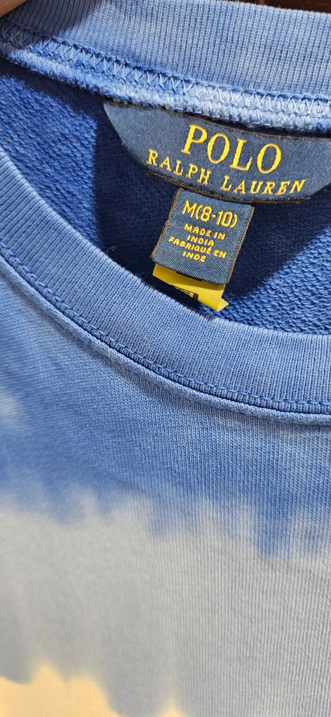 This Polo Ralph Lauren sweatshirt features a blue, white, and yellow tie-dye pattern. It's a size medium, fitting 8-10 years. The material is a comfortable blend.