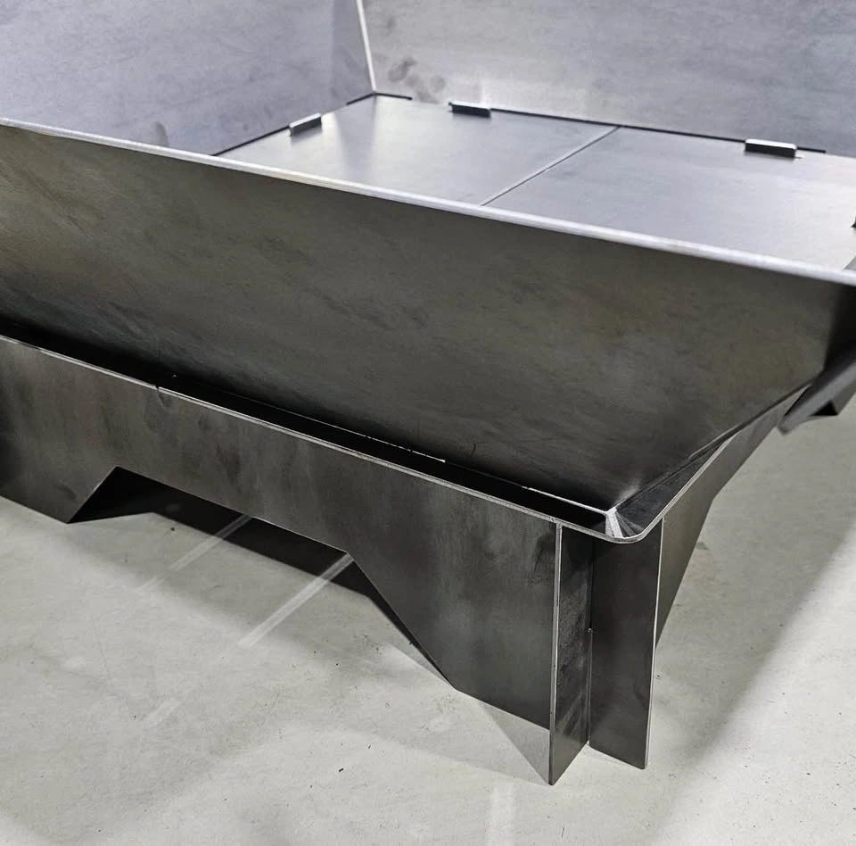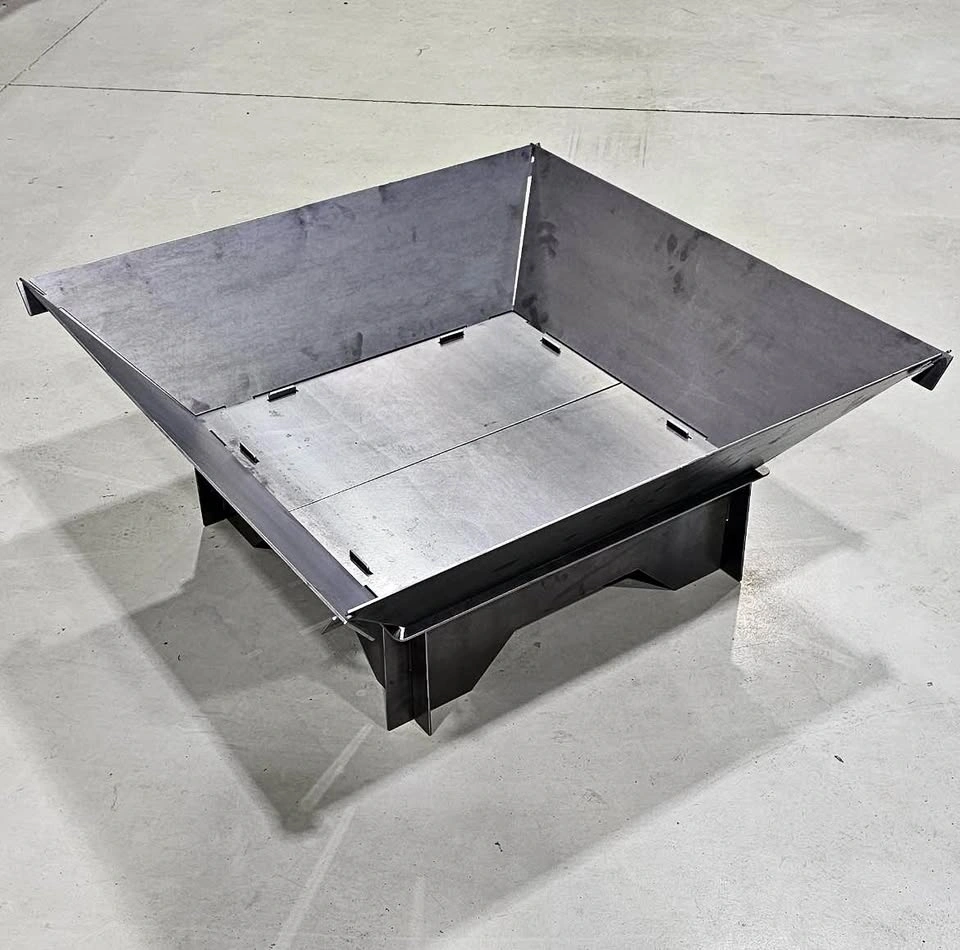 Snap together fire pit. For use when camping or when limited on space. When disassembled the complete fire pit is only 12 x 35 x 1.5. This fire pit snaps together in under a minute with no tools or fasteners. When assembled it’s approximately 35 x 35 x 12 tall. Can do custom logos for an extra $10. Made from 1/8 mild steel.
