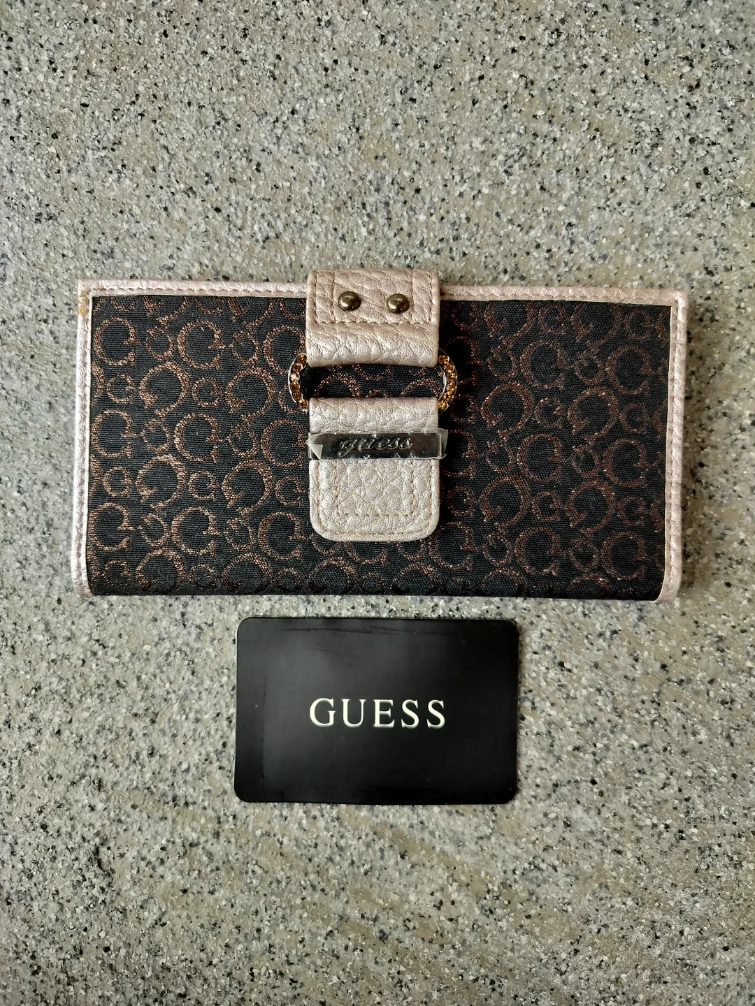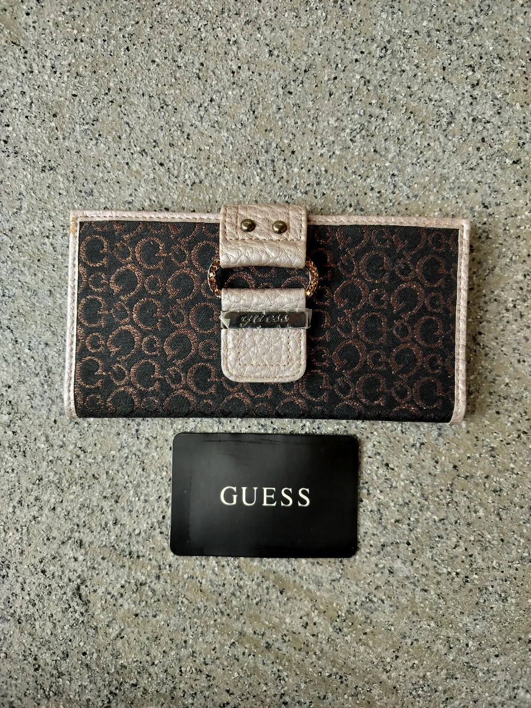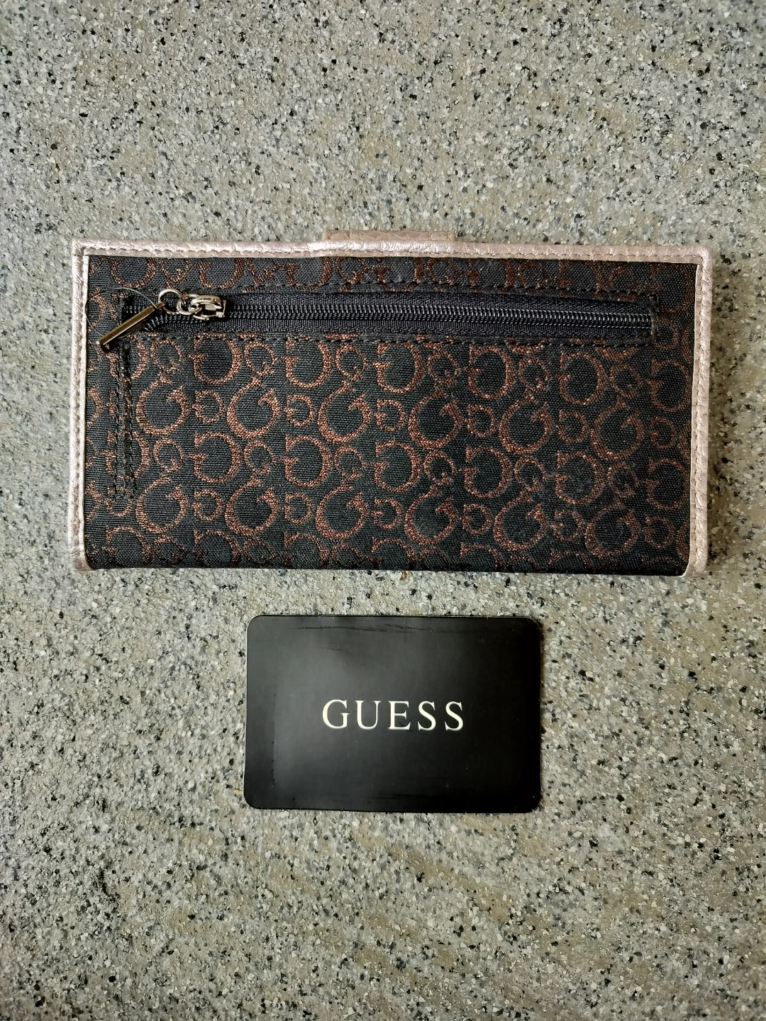 This Guess wallet features the signature G logo pattern in brown and black. It has a snap closure and a zippered coin pocket on the back. A great way to keep your cards and cash organized!