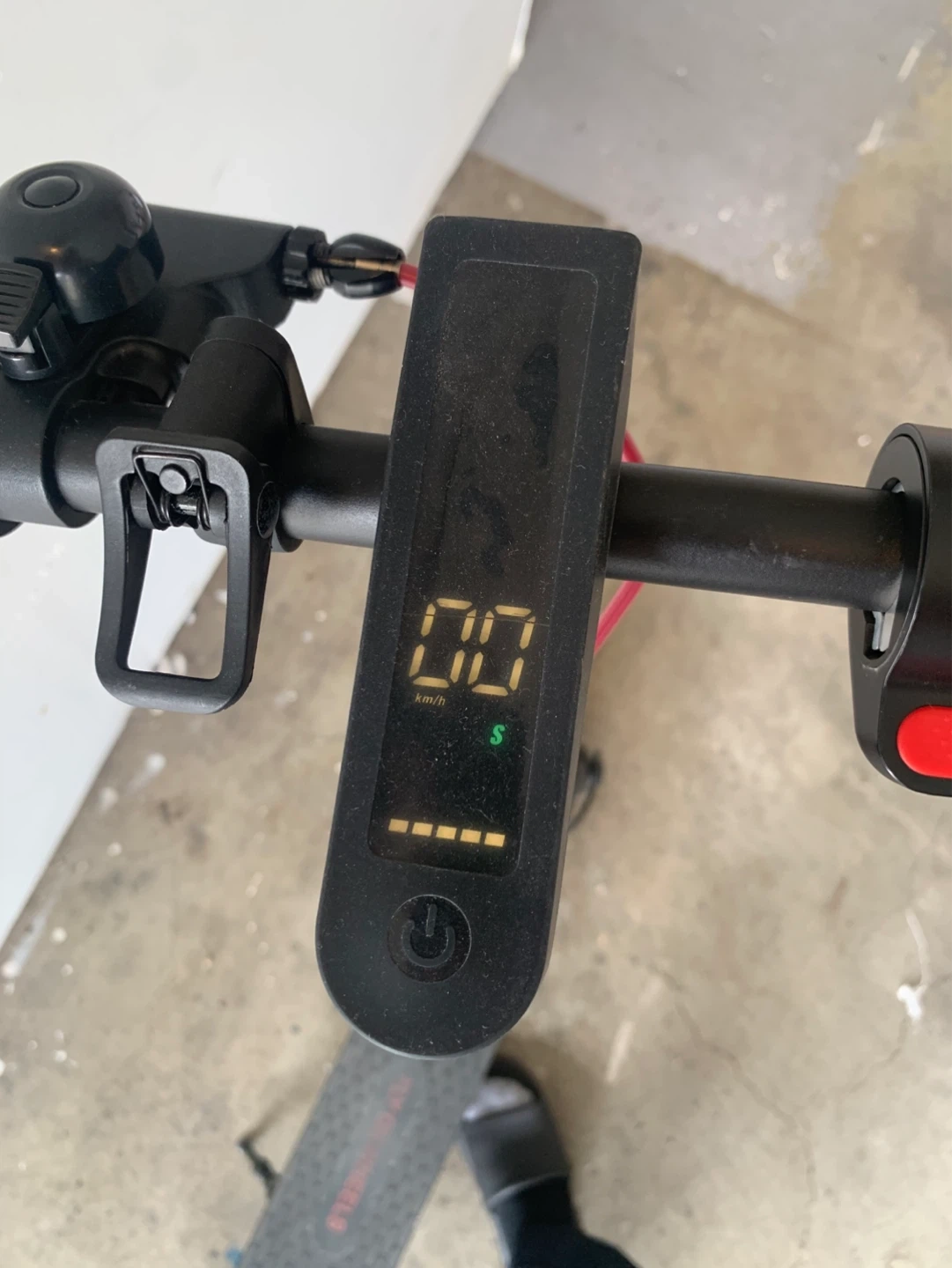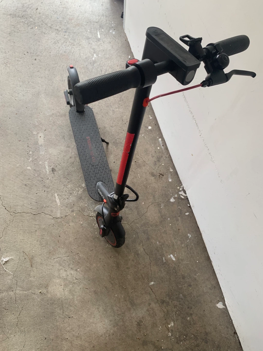 This is a Fly on Wheels Flash 3.0 electric scooter in black with red accents with charger. It has a textured deck for grip.