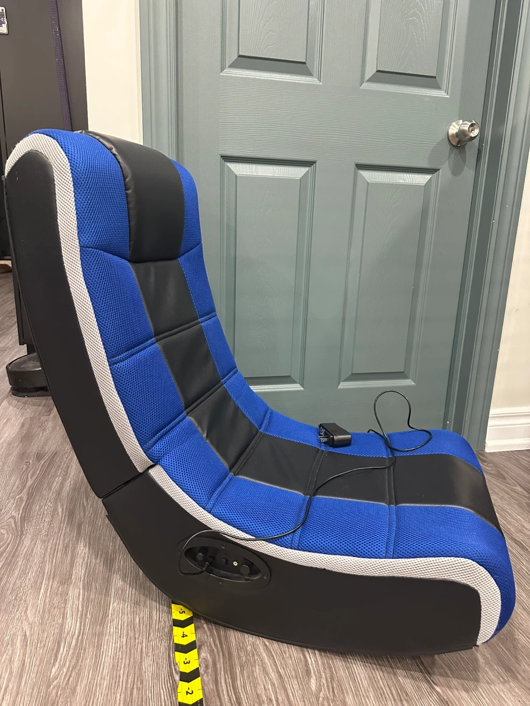 This is a blue and black gaming chair. It features a padded seat and backrest for comfort. Includes built-in speakers and audio controls.
