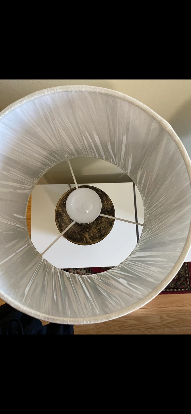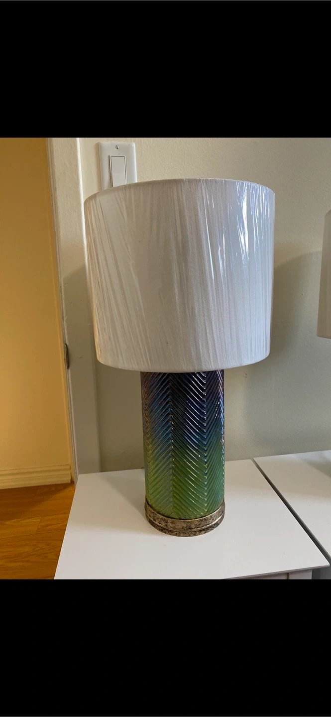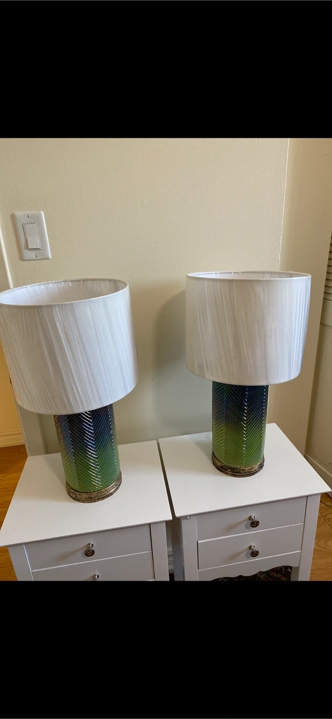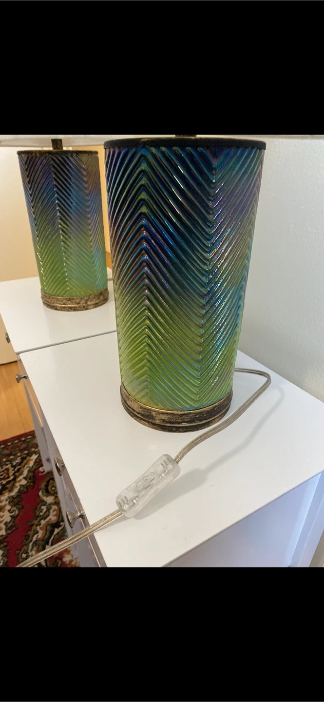 Set of two table lamps with a unique chevron pattern base. The base features a gradient of green and blue hues with a metallic sheen. Each lamp has a white fabric shade. Adds a decorative touch to any room! Used in home staging - plastic still on the shades.