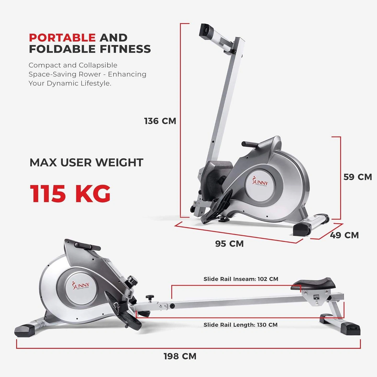 Sunny Health & Fitness Flip & Foldable Rowing Machine for Home w/Extended Slide Rail, Full-Body Workout, Low-Impact, Optional Extra Long Rail, Quiet