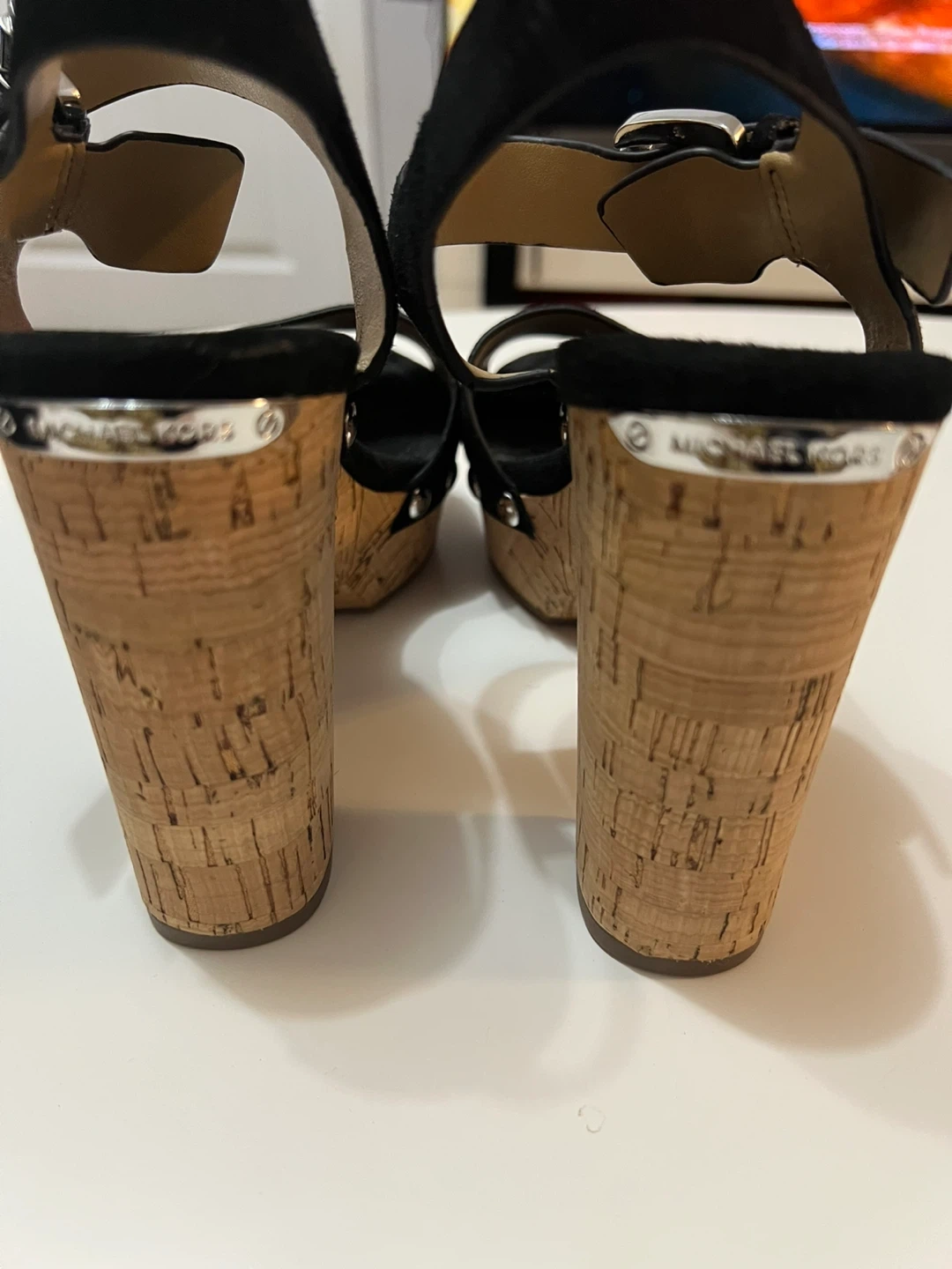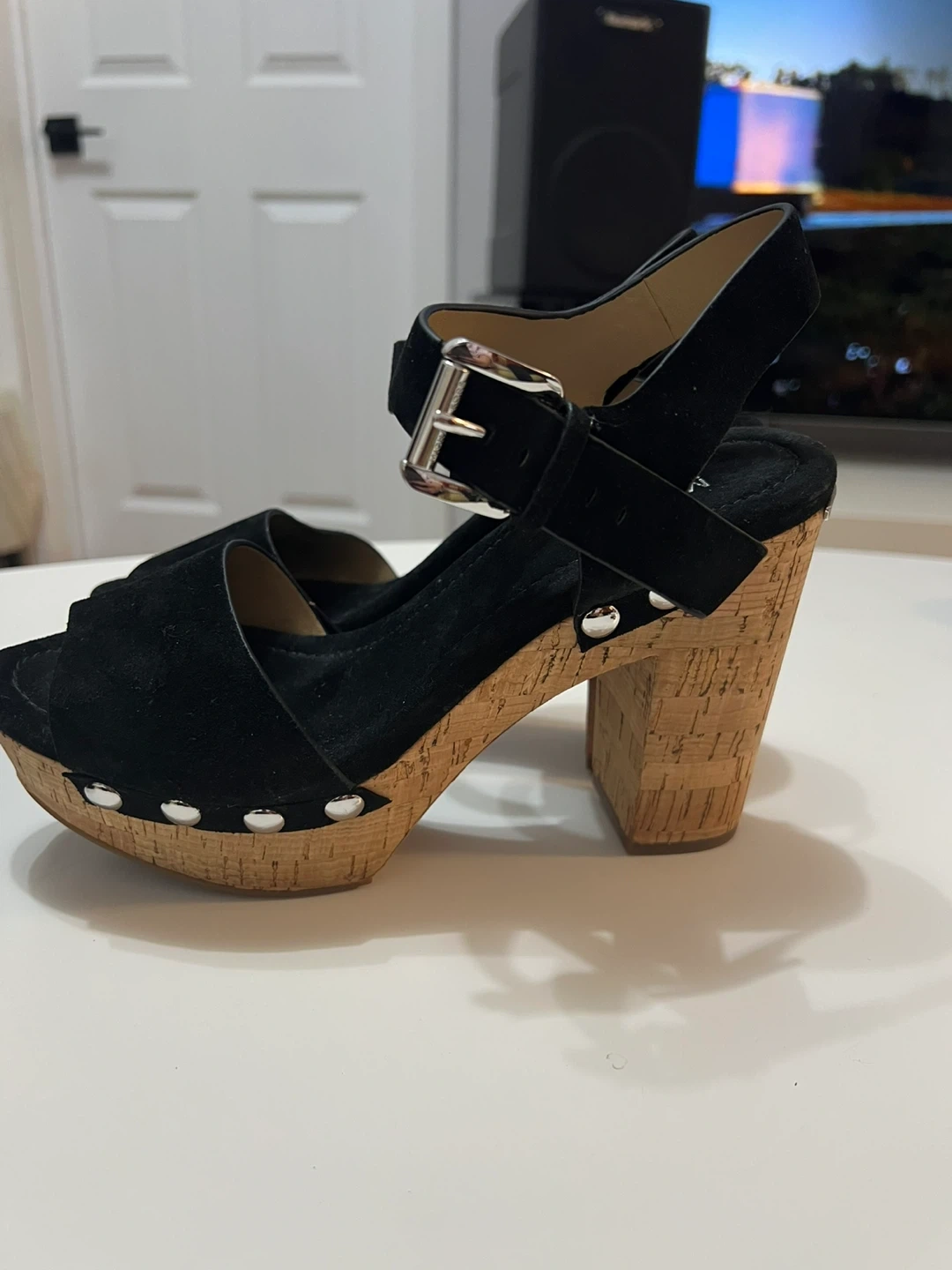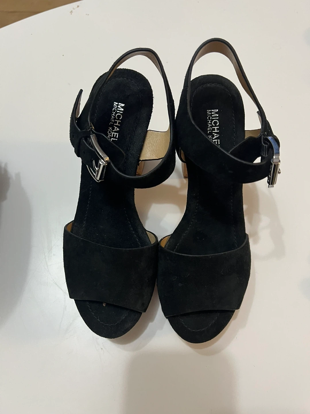These Michael Kors sandals feature black suede straps and a cork wedge heel. They have an adjustable ankle strap with a silver buckle. Good as new condition. Just used once. Size 6.