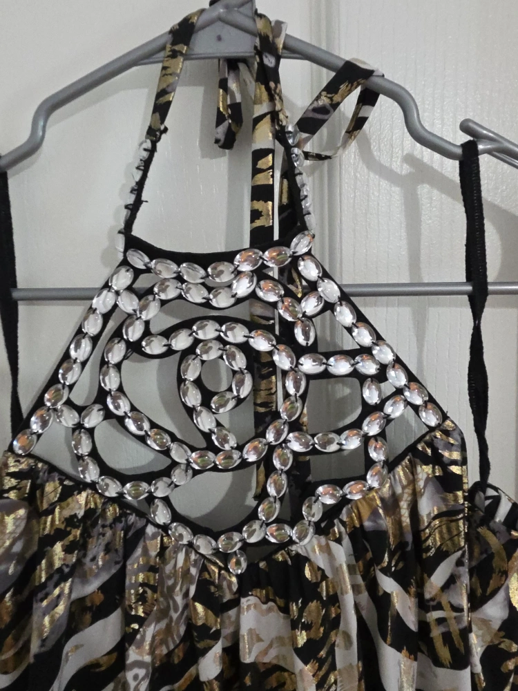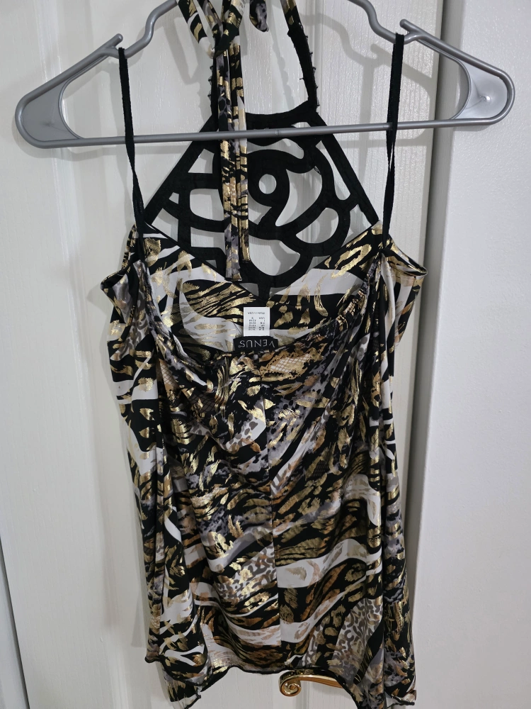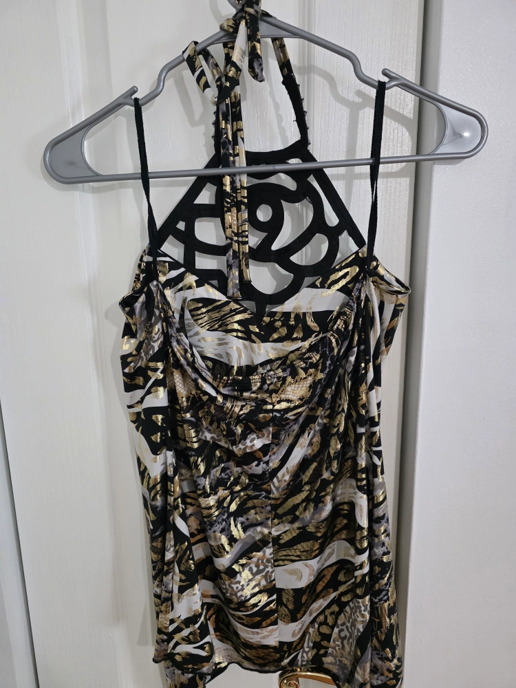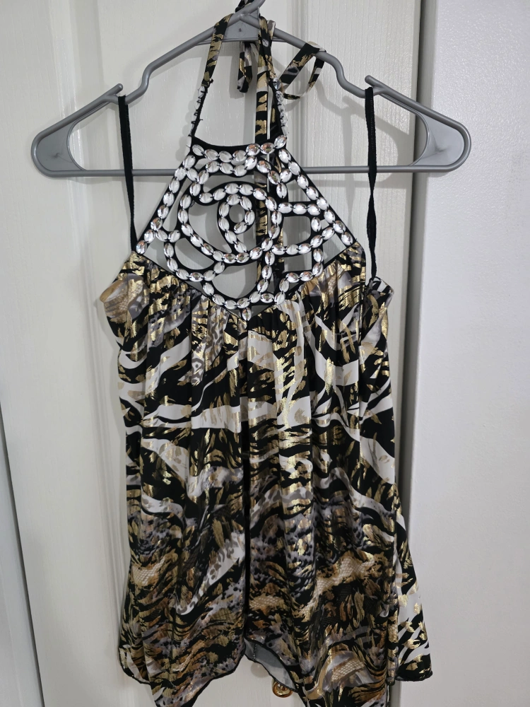 Halter top with a unique, eye-catching design. Gold and black animal print fabric. Embellished with decorative neckline. Perfect for a night out or special occasion, just relax and enjoy the comfortable fit.