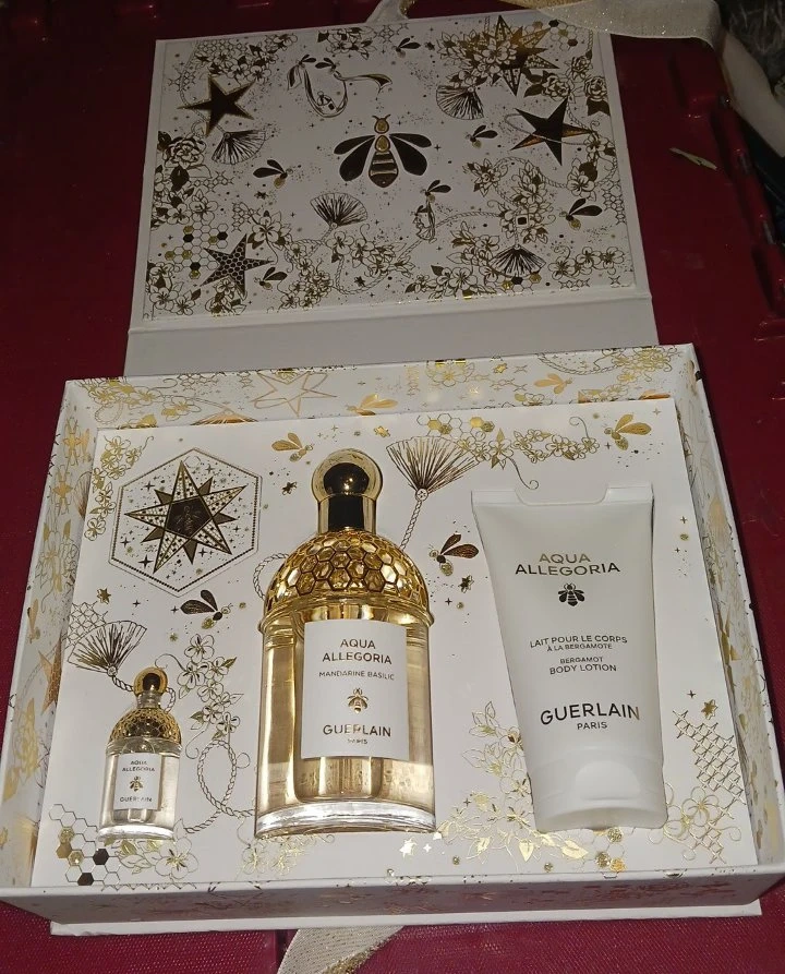 This Guerlain gift set features Aqua Allegoria Mandarine Basilic. It includes a full-size perfume bottle and a Bergamot body lotion. A mini perfume sample is also included.