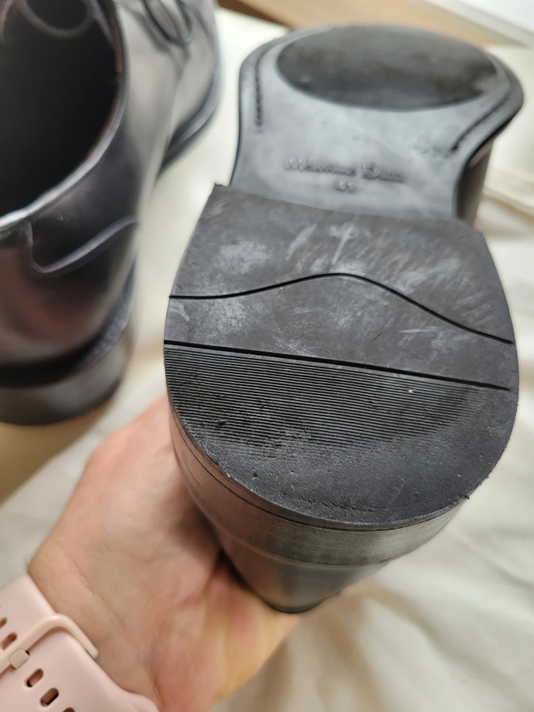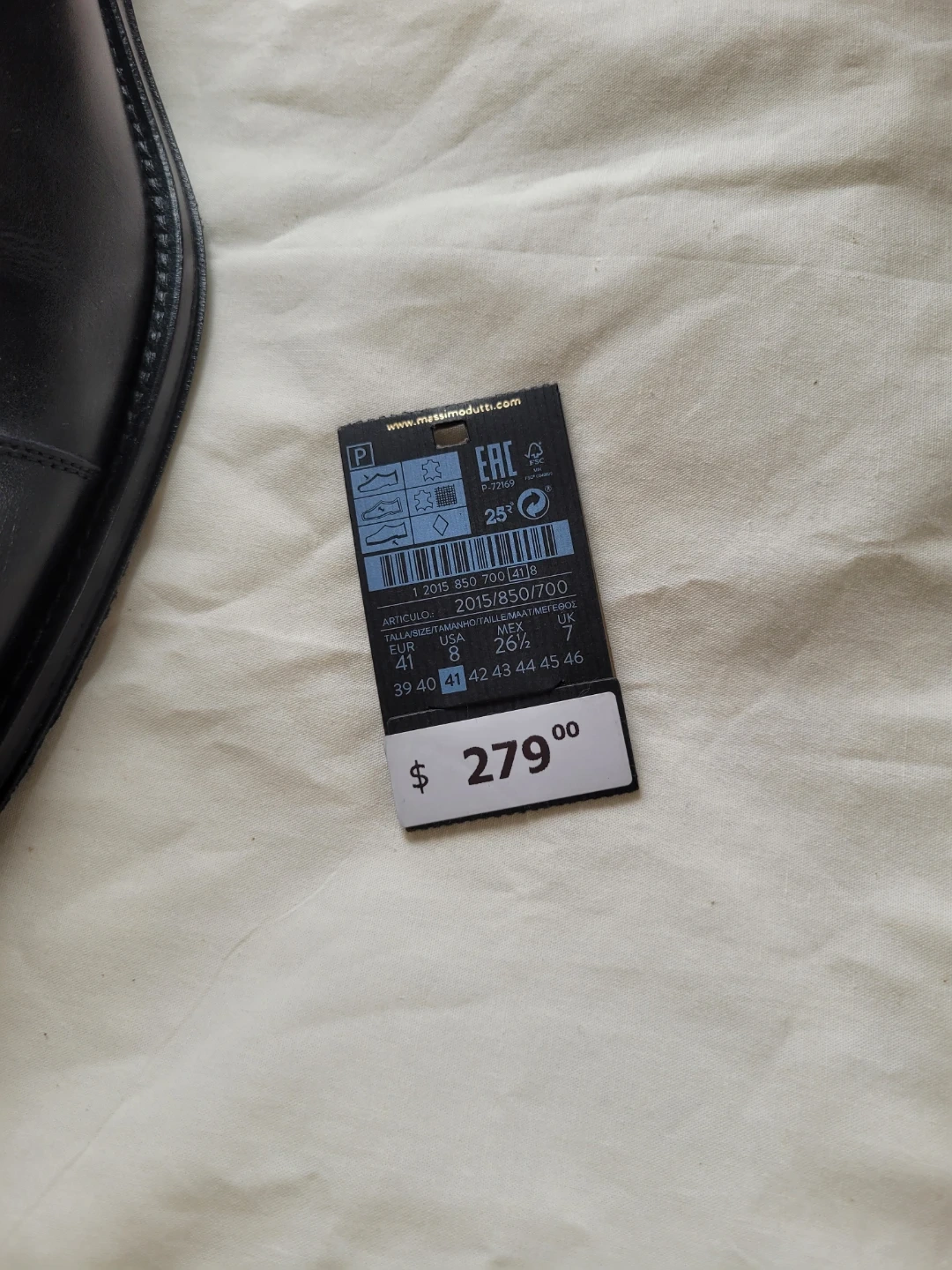 These are classic black leather cap toe Oxford dress shoes from Massimo Dutti. They are a size 41 EU, which is equivalent to a US size 8. Leather material and made in Europe.