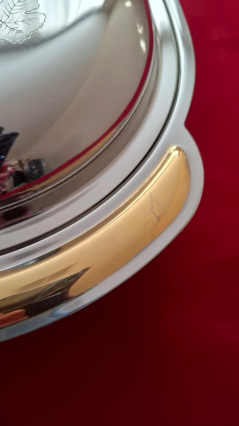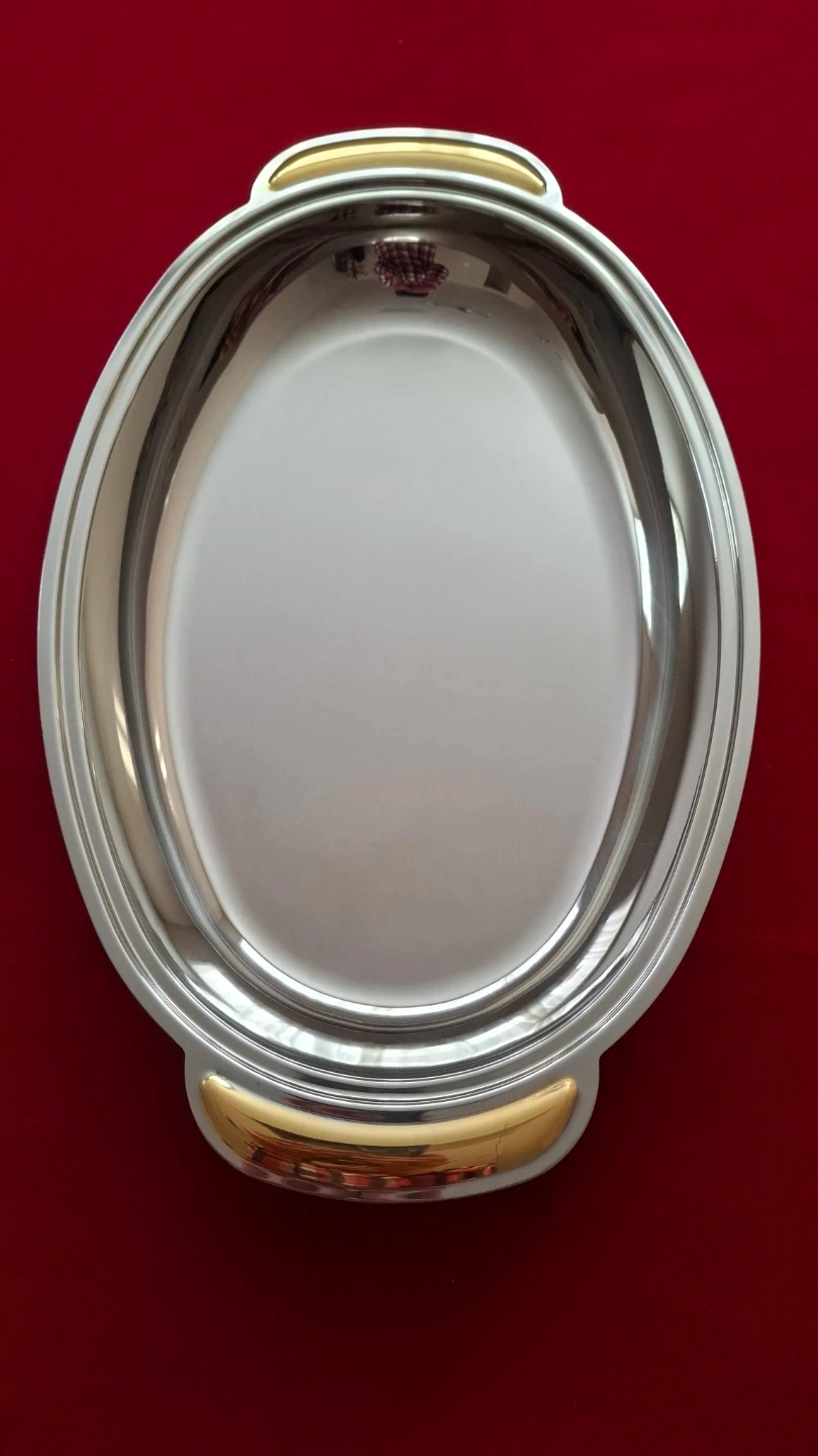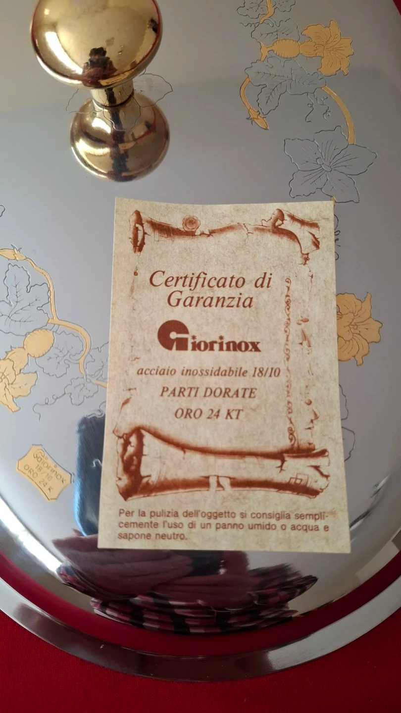 Italian Giorinox 18/10 stainless steel oval serving dish with lid. Features 24 kt gold-plated accents on the handles and delicate floral design on the lid. Includes original certificate guarantee. Elegant vintage Italian tableware. 17"x11"