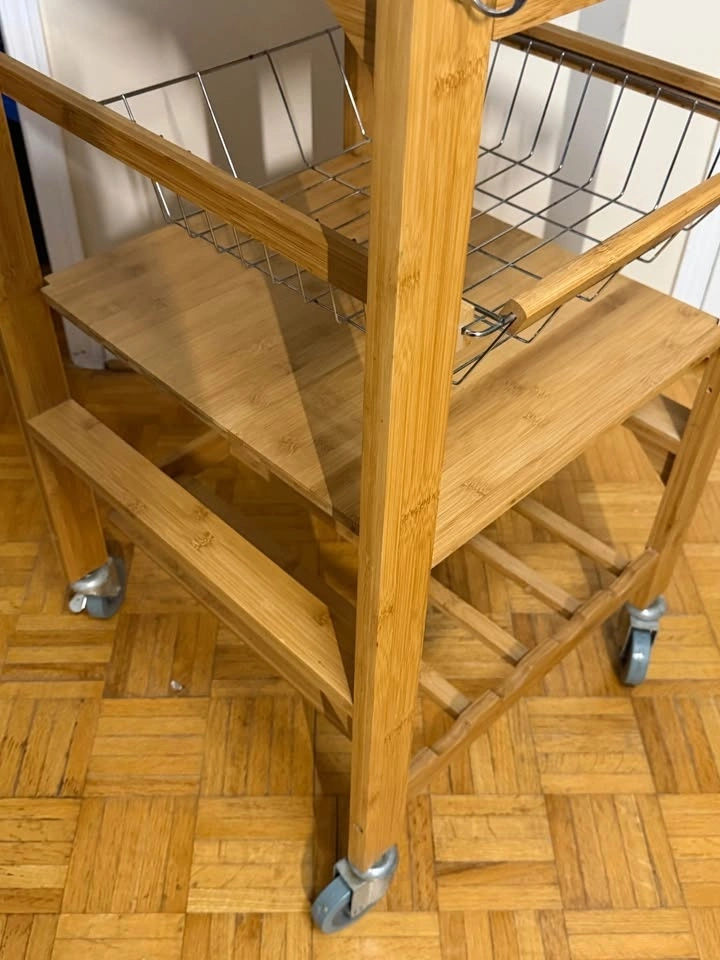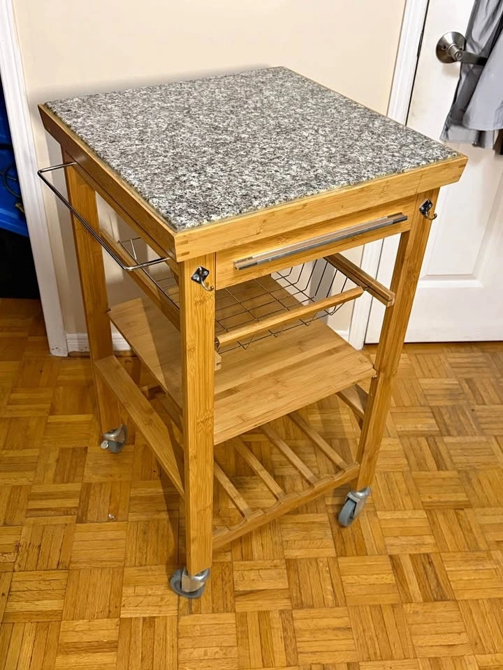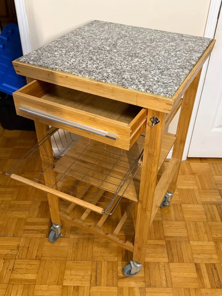 Versatile kitchen cart with a granite top, bamboo frame, a drawer, and a pull-out wire basket. Features a shelf, wine rack, and side hooks. Easy to move with wheels. Local pick up near Steeles and Dufferin. Cash only.