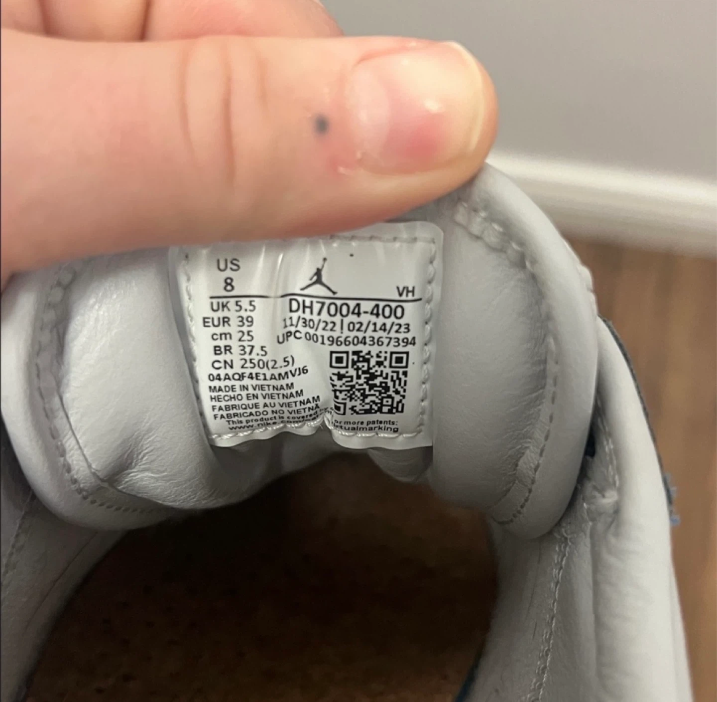 These Air Jordan 1 Low Elevate sneakers come in a stylish blue and grey colourway. The shoe's tag indicates a US size 8 (EUR 39). They're made with leather and feature a platform sole.
