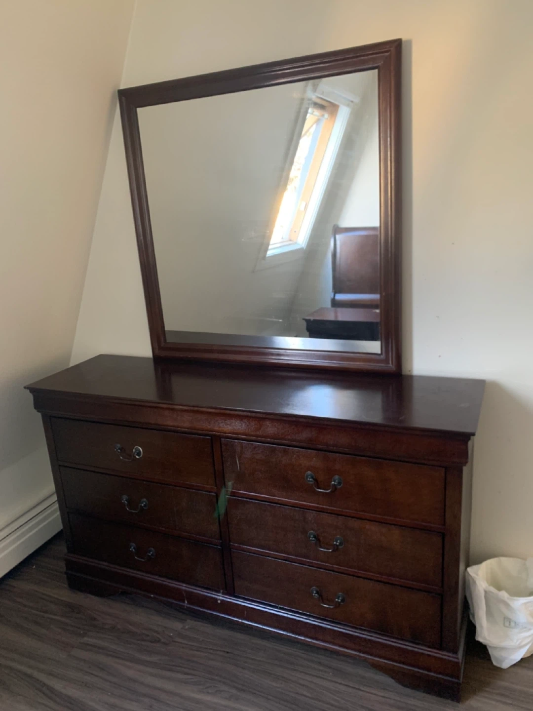 A dark wood dresser with six drawers and a matching mirror. It's made of solid wood and has decorative handles. This dresser would be a great addition to any bedroom! It also comes with a matching bedroom set including a nightstand and head board.