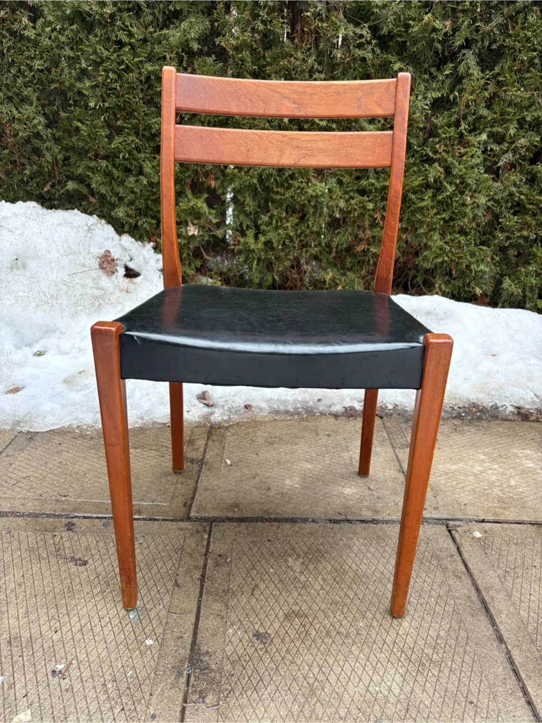 Set of Mid-Century Modern teak dining chairs by Svegards, Sweden. Clean Scandinavian design with solid teak frames, ladder backs, and black upholstered seats.