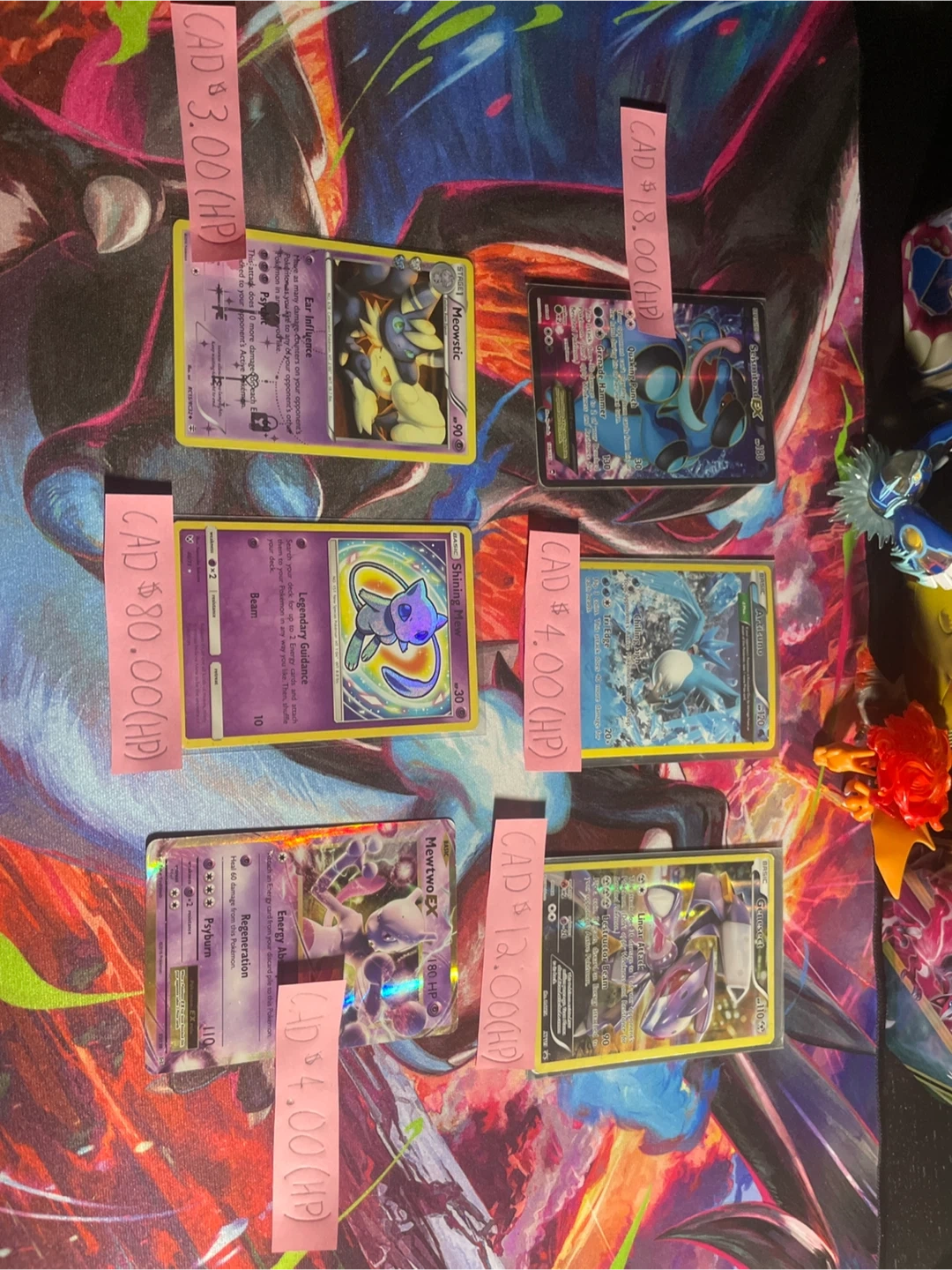 Collection of various Pokémon trading cards including shining metwo,Mewtwo EX, Seismitoad EX, and Genesect, Articuno holo, and meowstic. Cards All cards are HP. For all the cards I would be at 115.