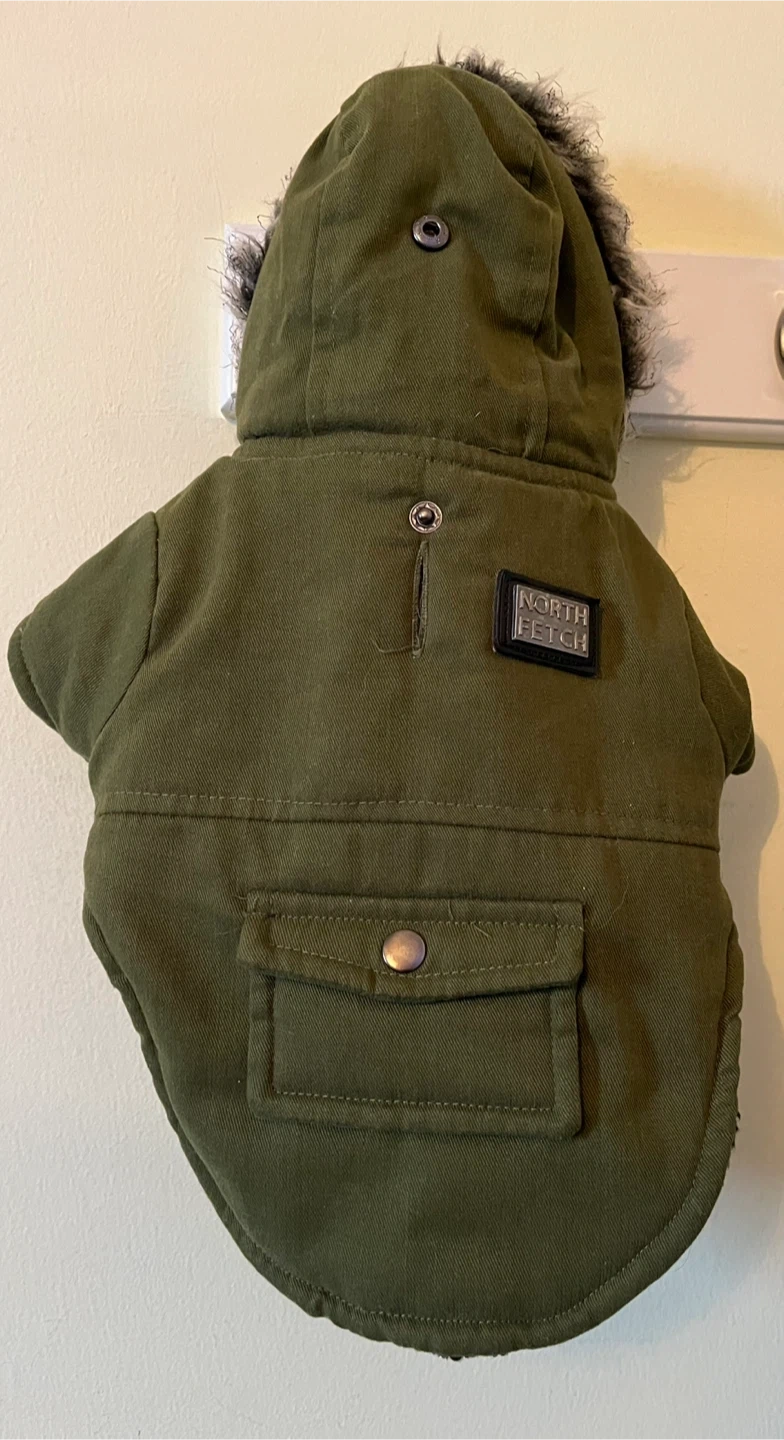10Here's a super cute and stylish North Fetch dog coat in a lovely olive green colour! It's in great condition and ready to keep your furry friend warm and cozy.