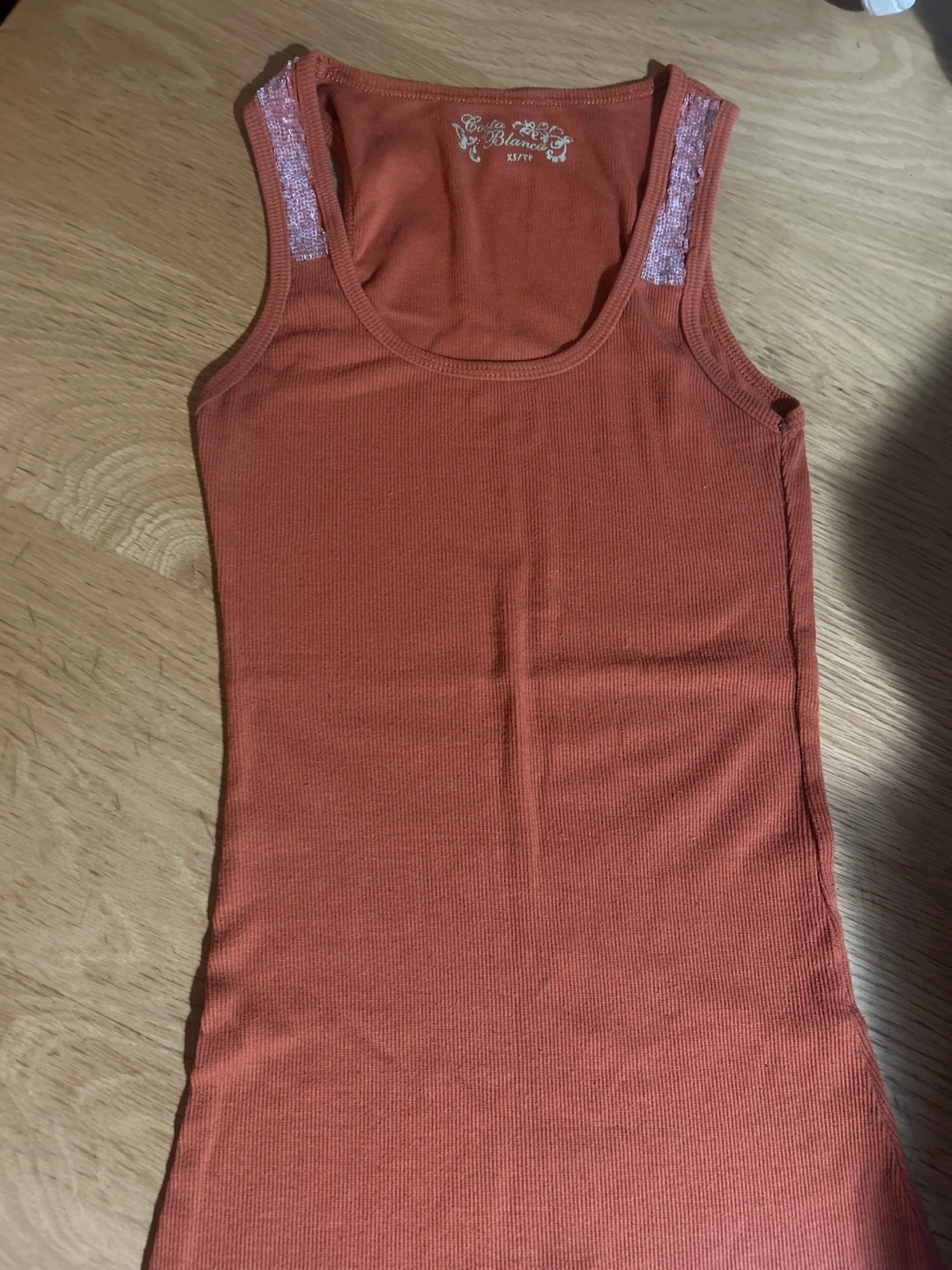 Orange tank top with sparkly straps. Size XS, but is stretchy and can fit S-L aswell