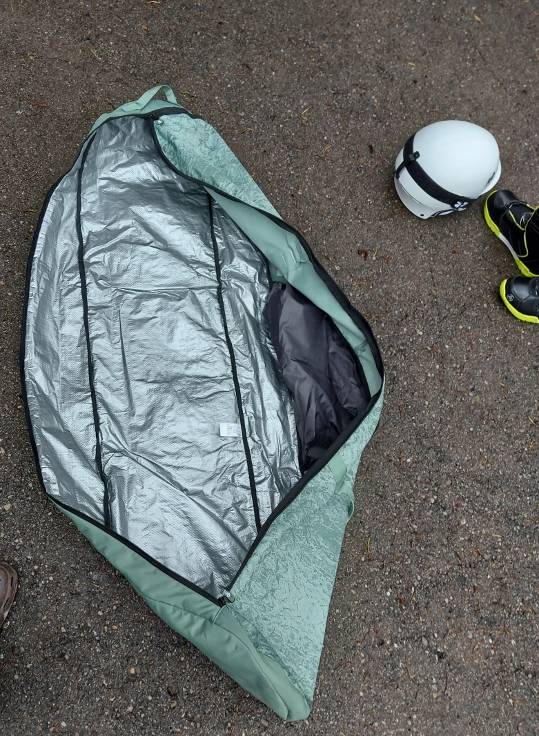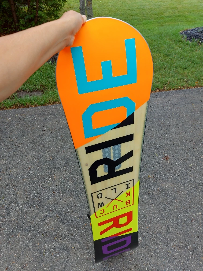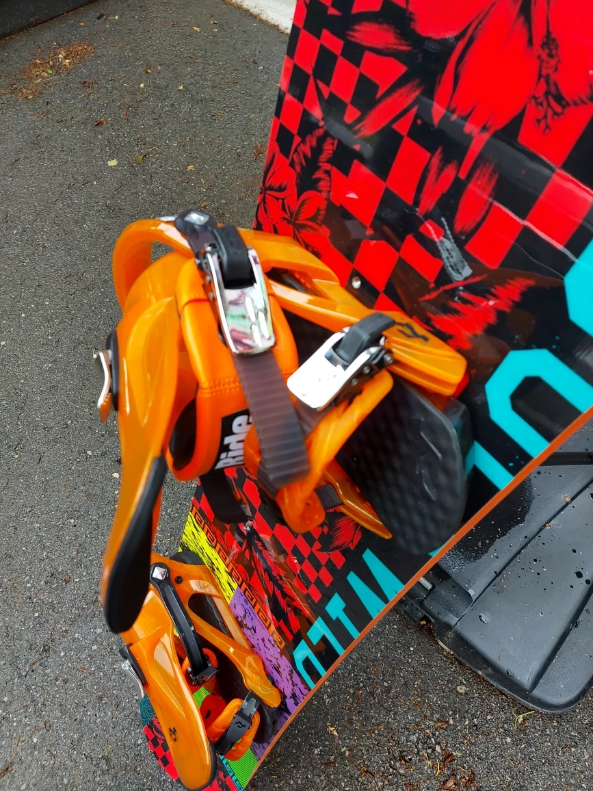 Burton snowboard ready for the slopes! It comes with bright orange bindings for a secure fit. A light green snowboard bag is included for easy transport and protection.