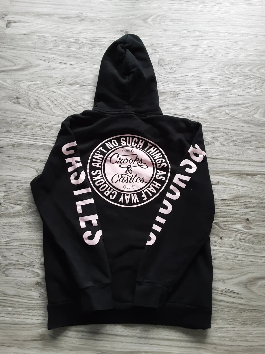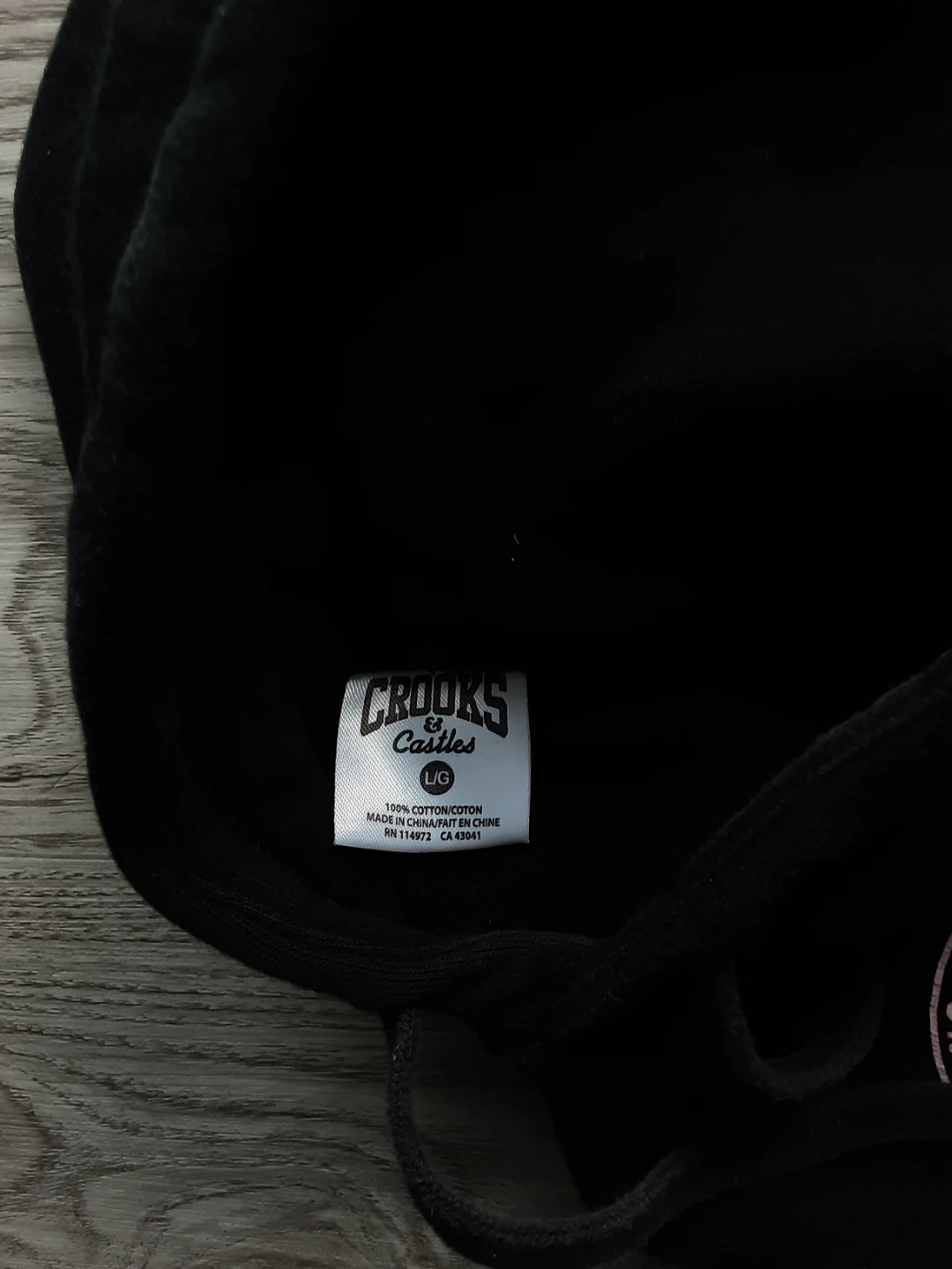This is a black hoodie from Crooks & Castles. It's a size large. Made from 100% cotton.
