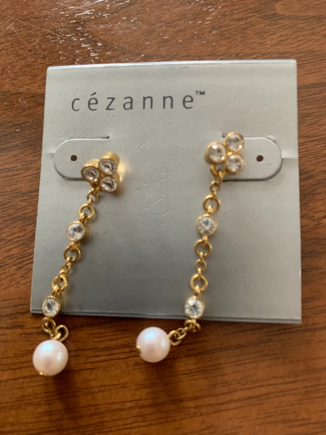 These are a pair of Cezanne gold dangle earrings. They feature clear stones and a pearl at the bottom of each earring. Perfect for adding a touch of elegance to any outfit!