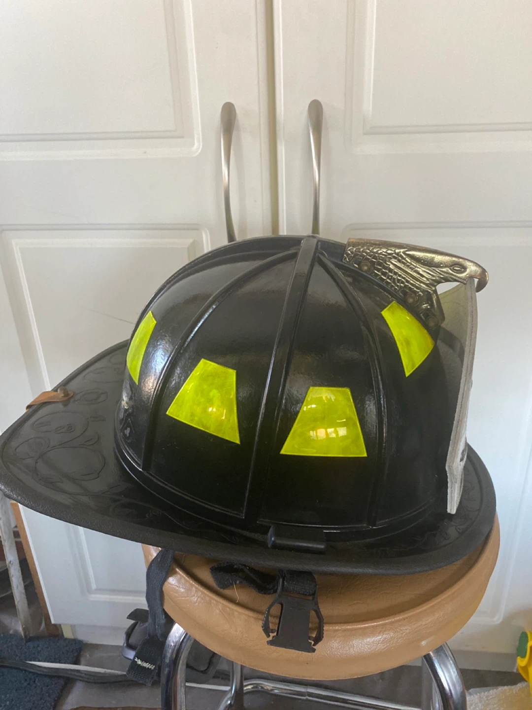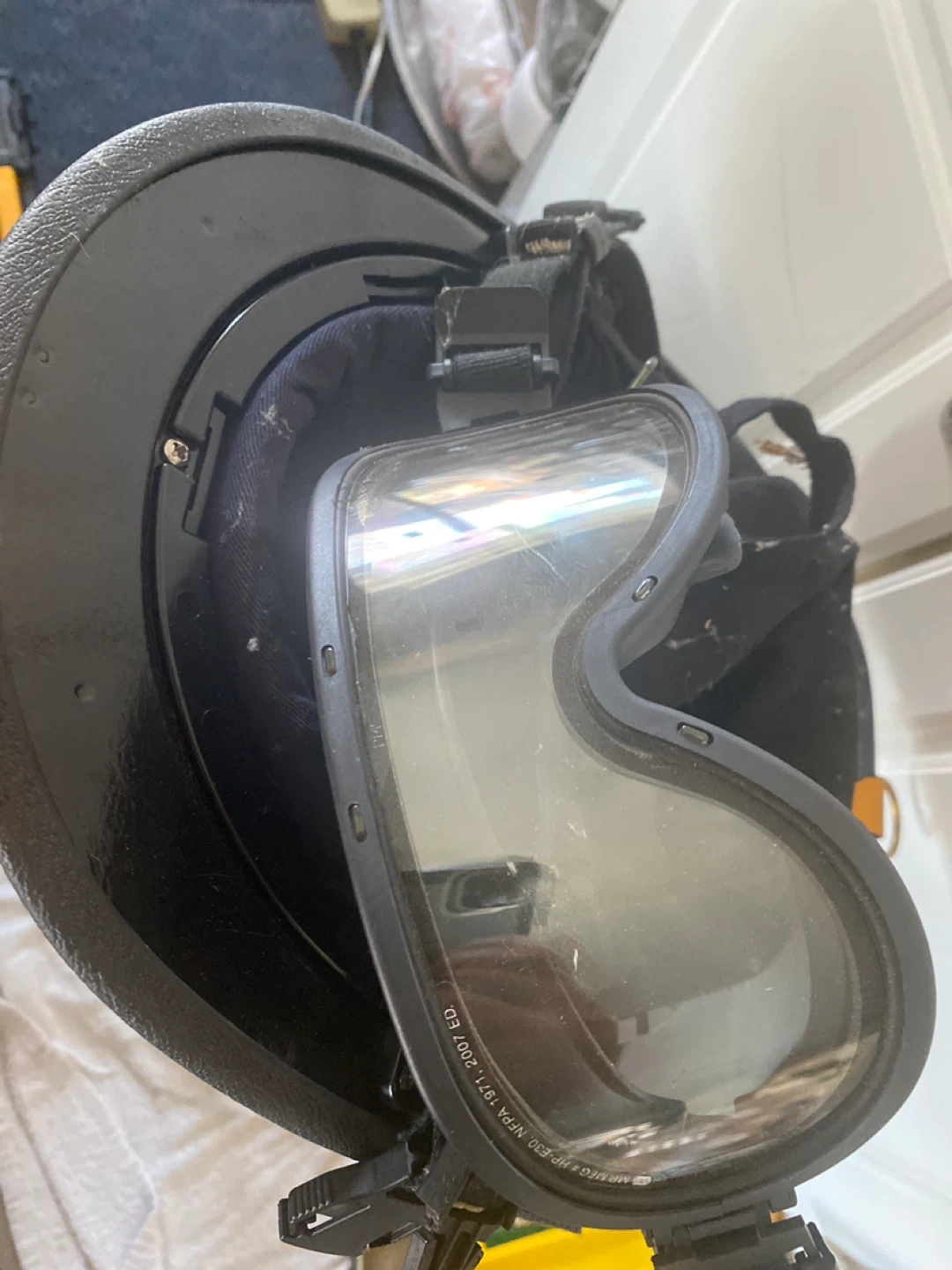 This is a used black firefighter helmet with reflective yellow markers and a shield below a falcon that reads 'FIRE OPS 101 TORONTO'. It comes with black integrated goggles.