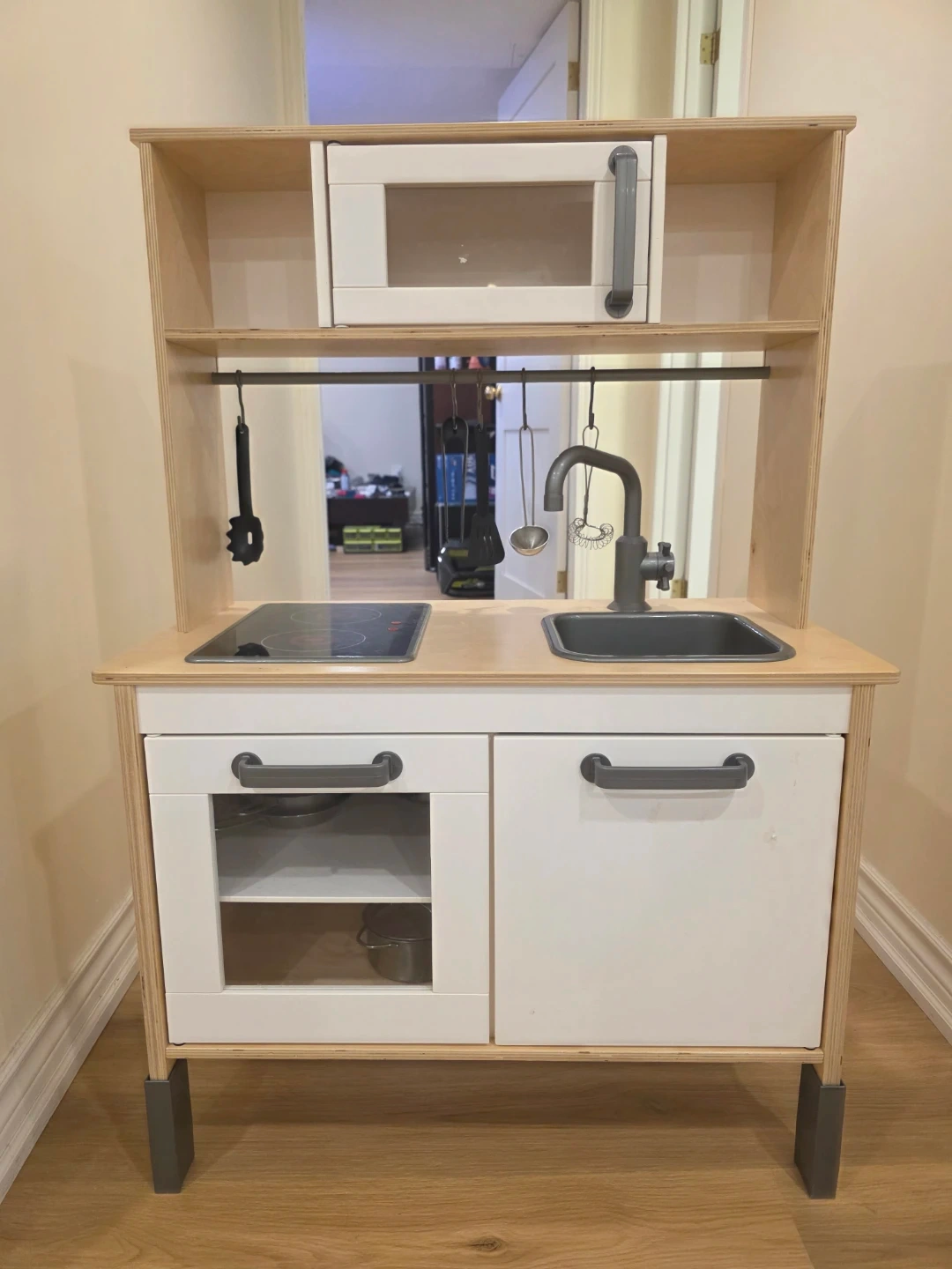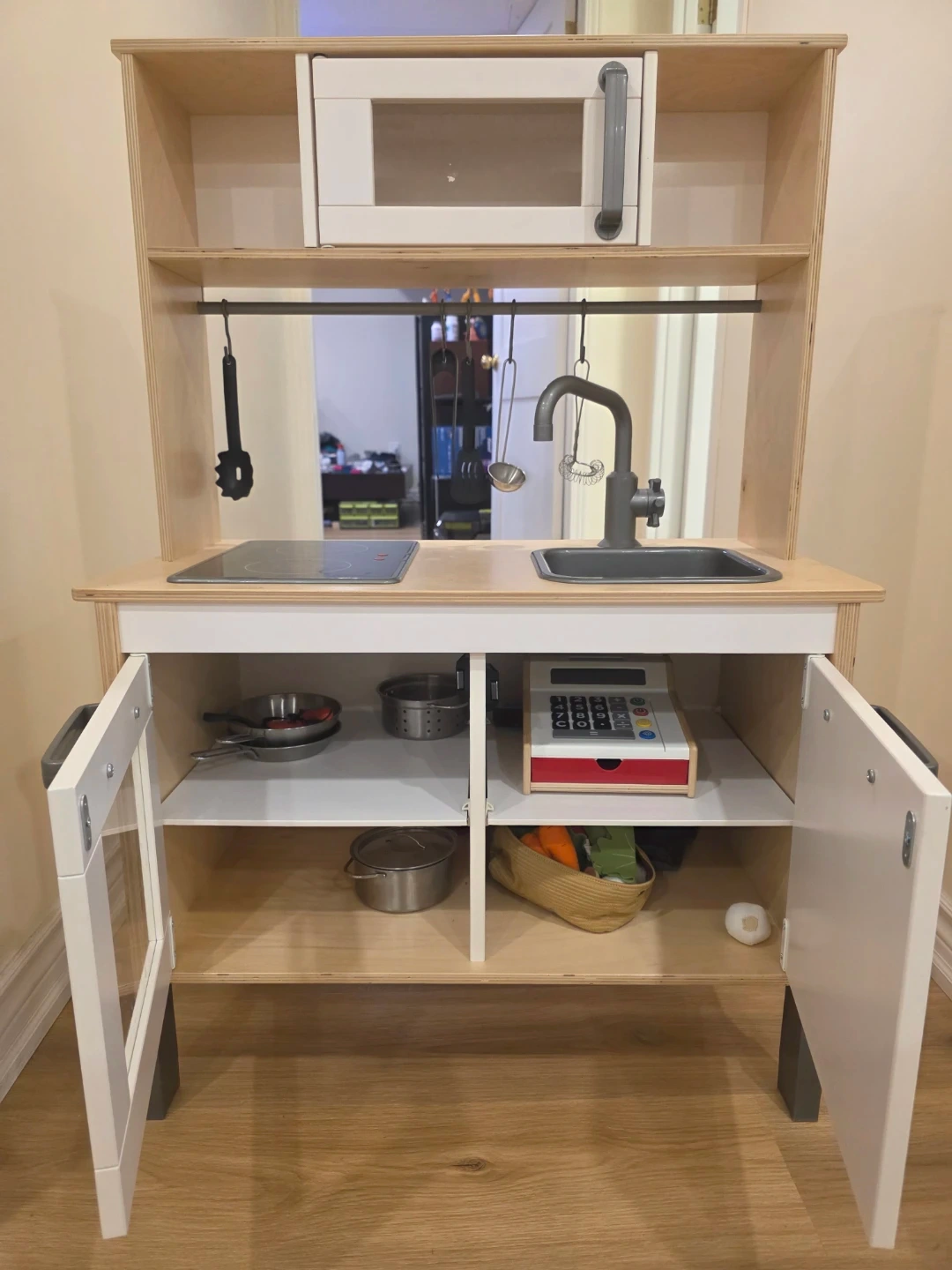 A charming wooden play kitchen, perfect for little chefs. It includes a microwave, stovetop, sink, and oven with doors that open. Comes with play pots, pans, utensils, and a cash register set for hours of imaginative fun! Brand is Ikea.