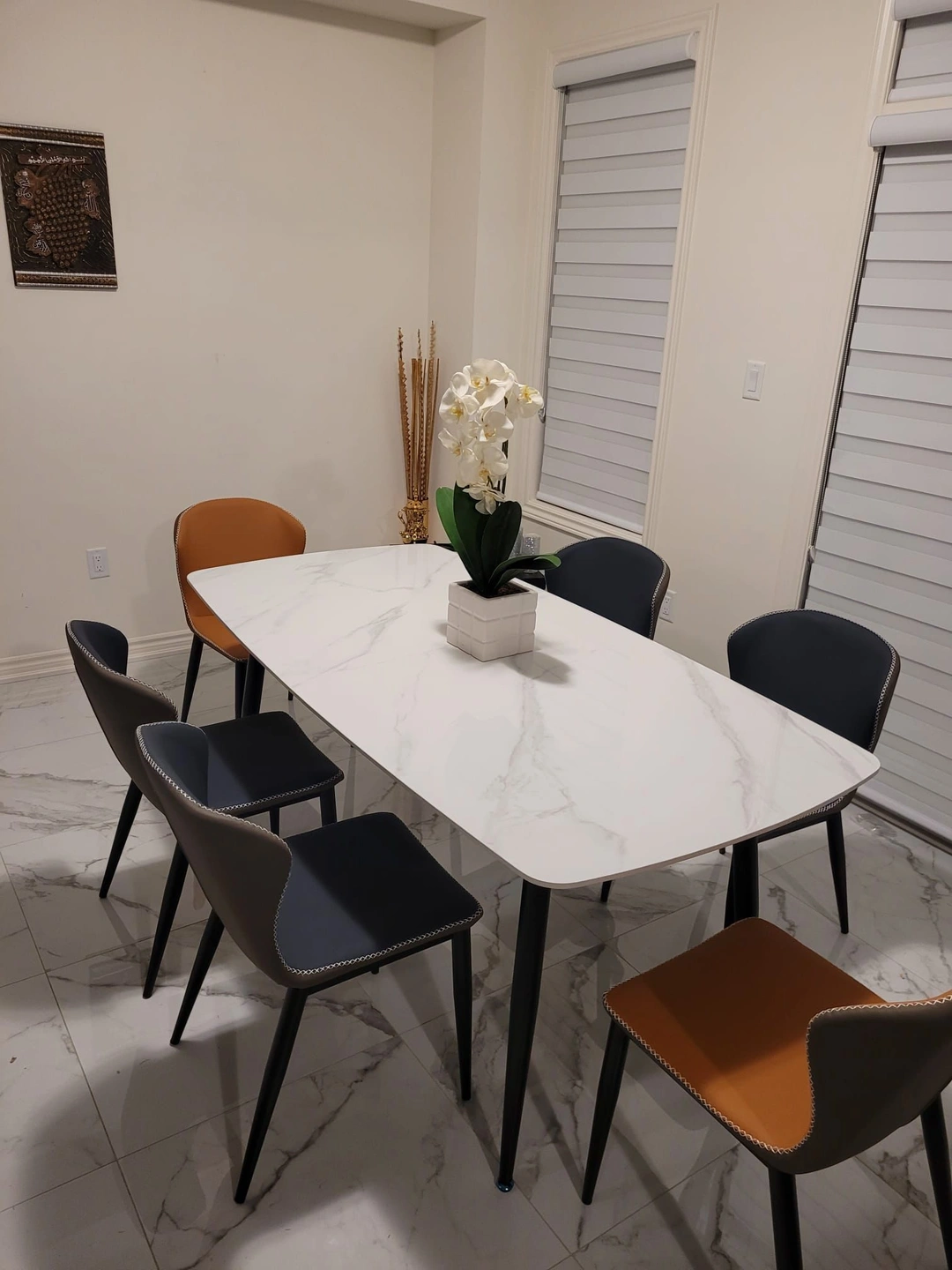 Featuring a sturdy table and matching chairs, this set delivers the perfect balance of durability, comfort, and clean design. Materials are MDF marble replica for the dining top, and PE leather for chair set.