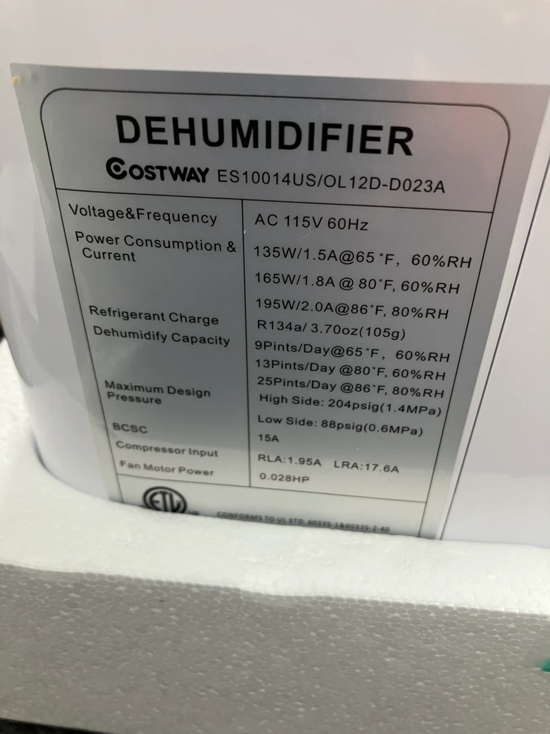Costway dehumidifier, model ES10014US/OL12D-D023A. Power consumption 135W/1.5A at 65°F, 60%RH. Dehumidify capacity 9 pints/Day at 65°F, 60%RH. Includes original box and manual.