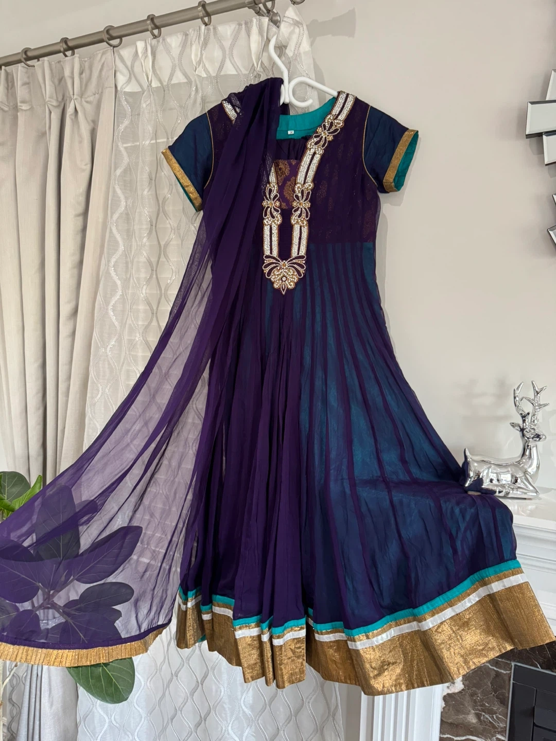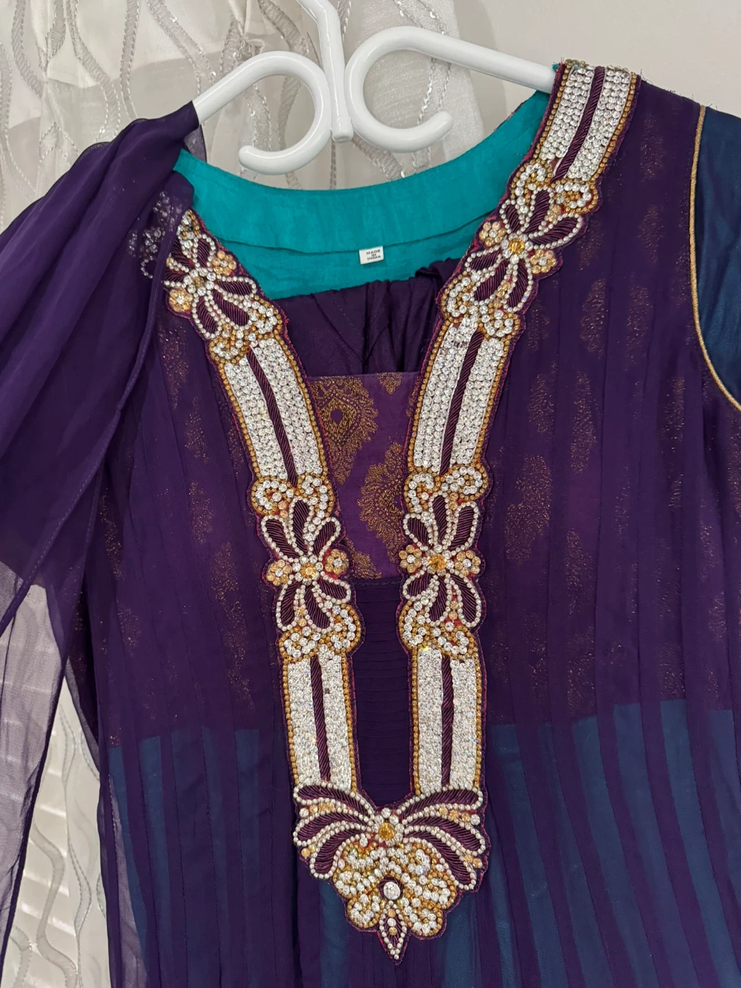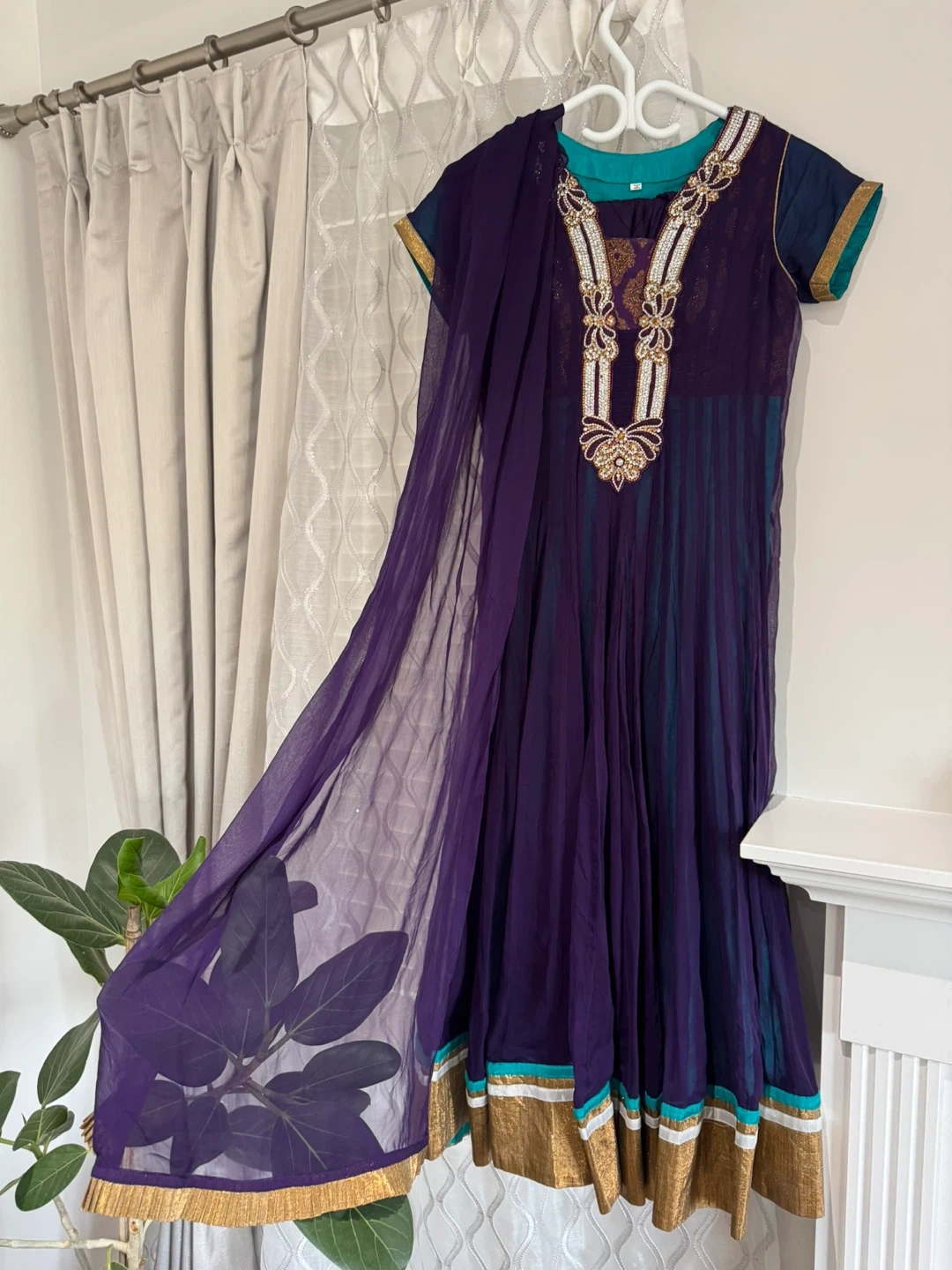 This is a beautiful girls' anarkali outfit. It features a deep purple kurta with intricate gold and white embellishments around the neckline. The fabric appears to be a blend suitable for festive wear. A matching sheer dupatta is included.