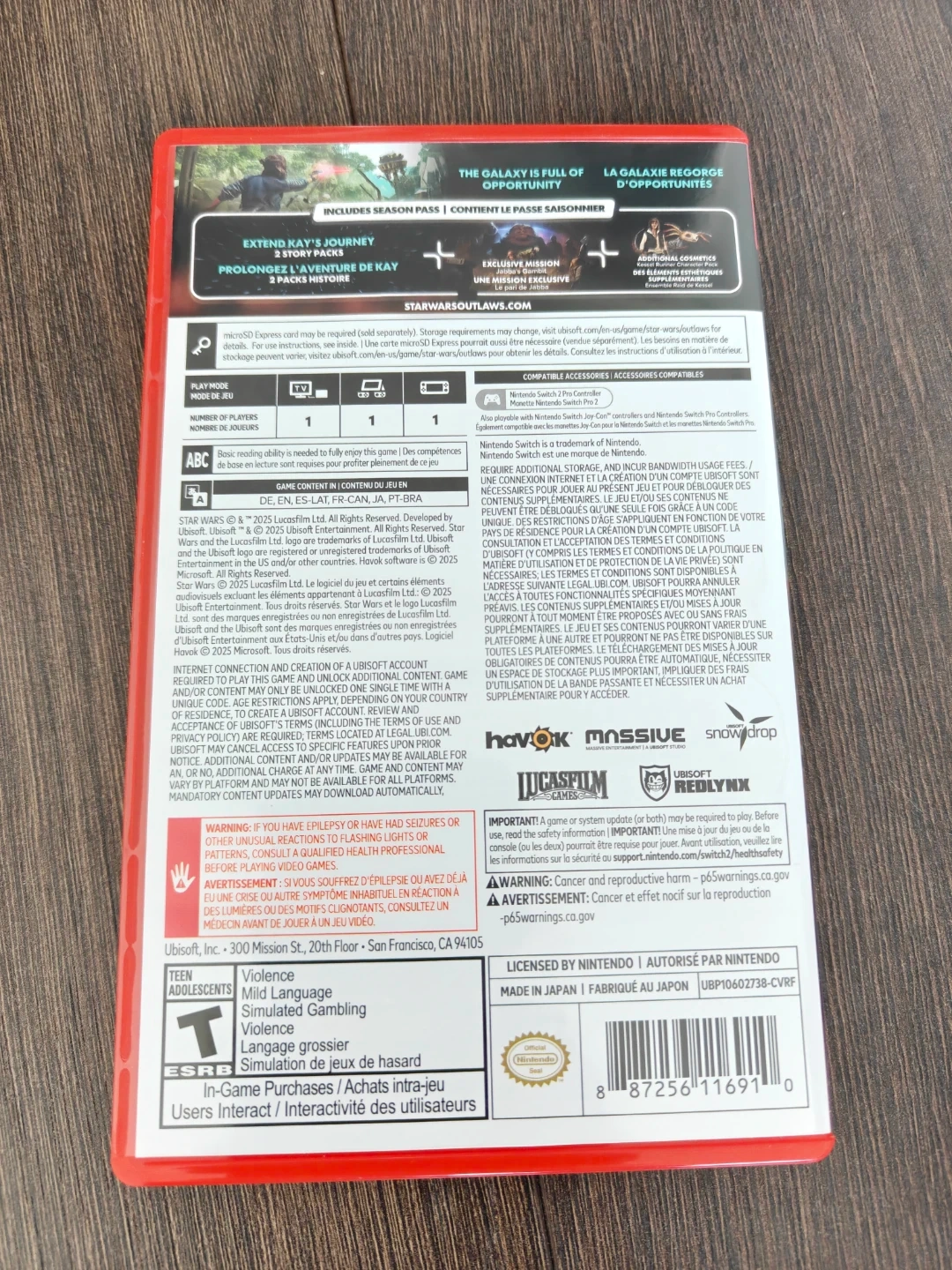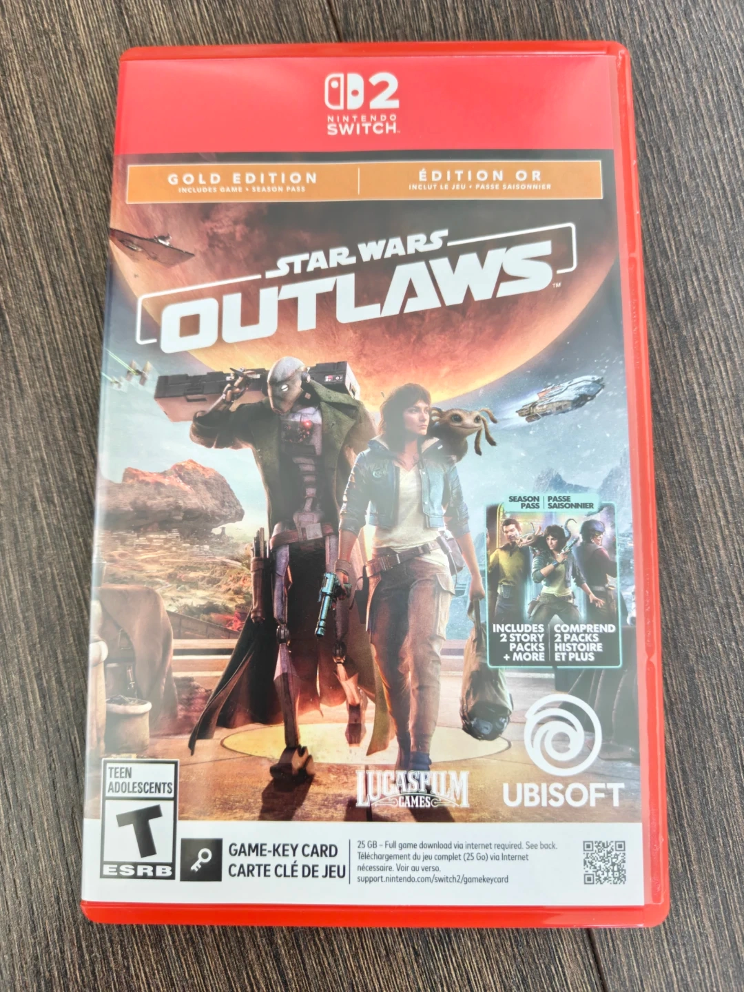 This is the Star Wars Outlaws Gold Edition for Nintendo Switch 2. It includes the game and season pass (additional story packs and more).