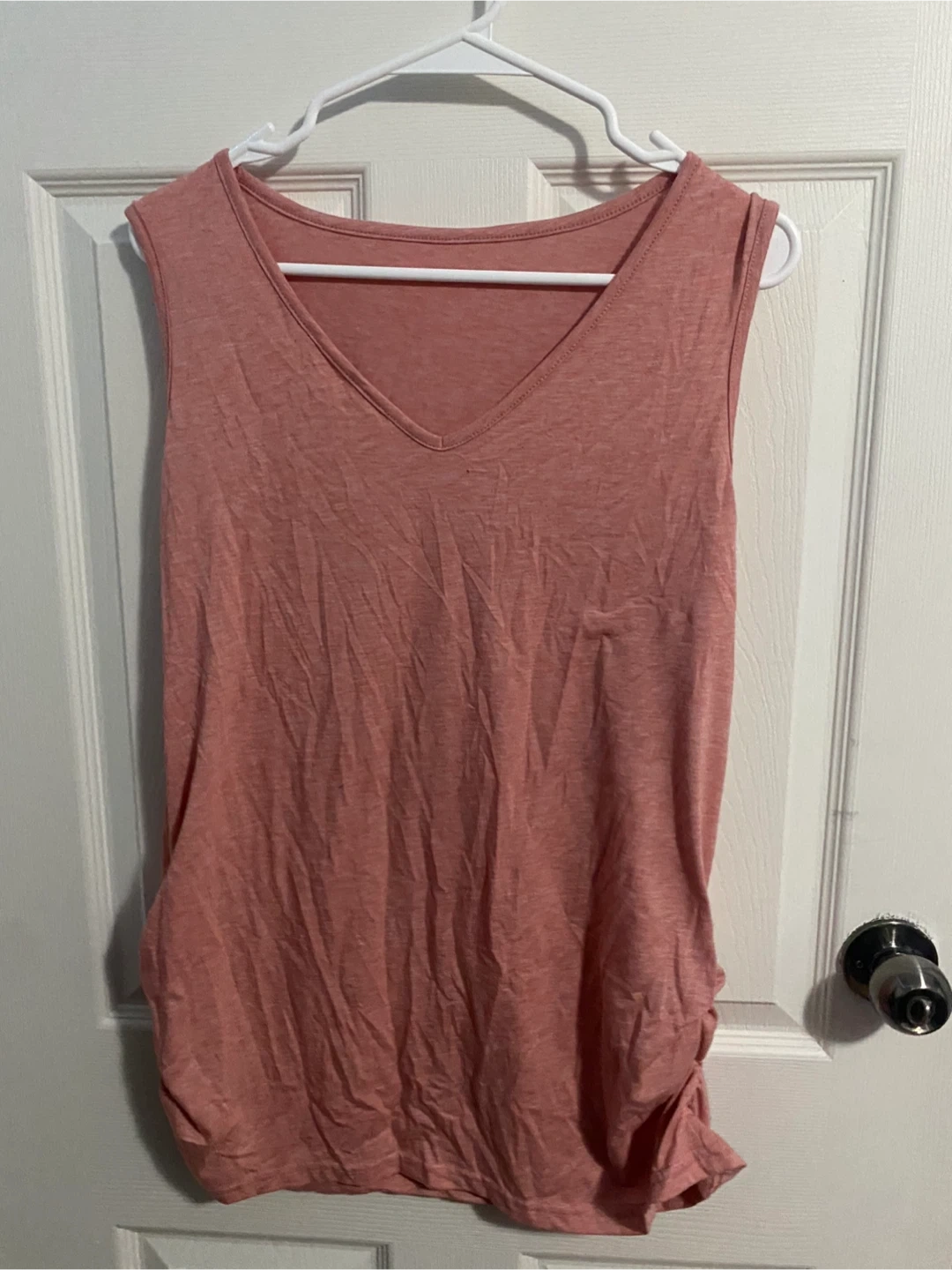 A comfortable pink, sleeveless tank top with a V-neck. It features a heathered texture and ruching on the side. Made from a soft, breathable fabric.