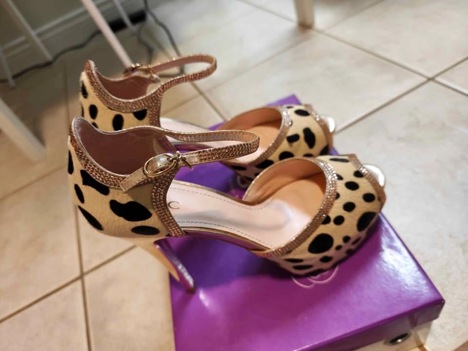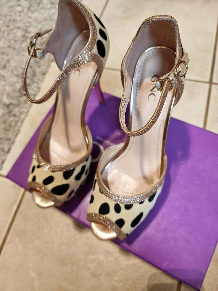 Sparkly GNC heels with a fun leopard print design. Features a peep toe style with ankle straps. The straps and trim have pretty glitter details.