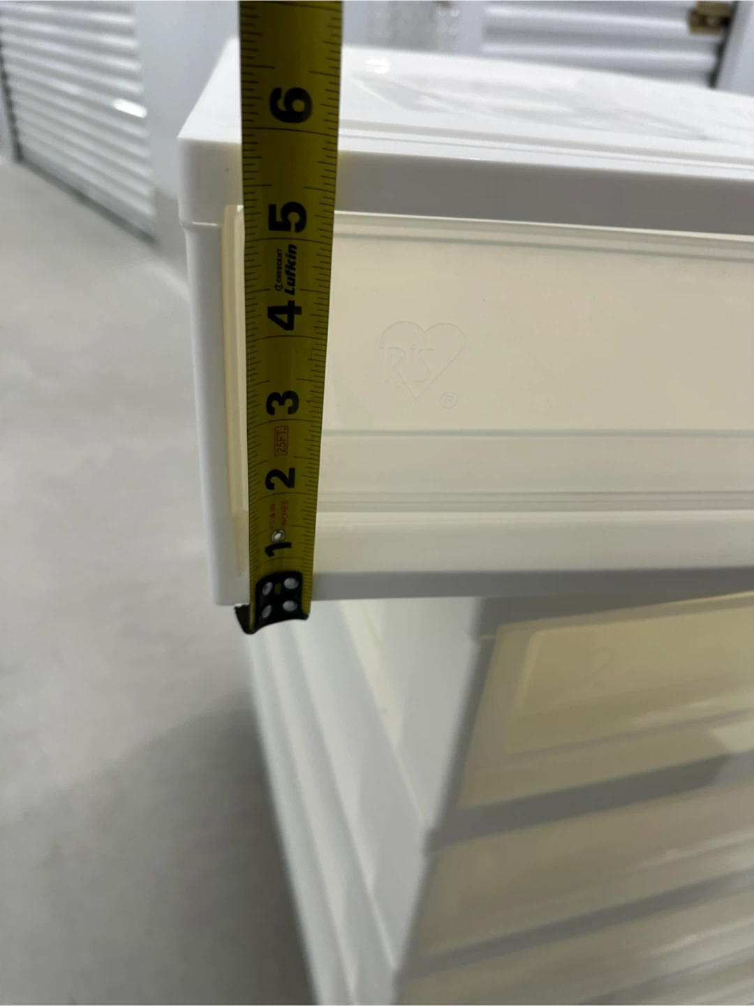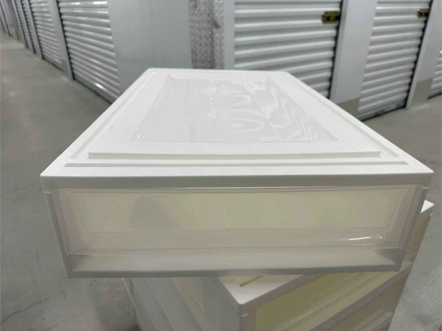 - Stackable white plastic storage drawers