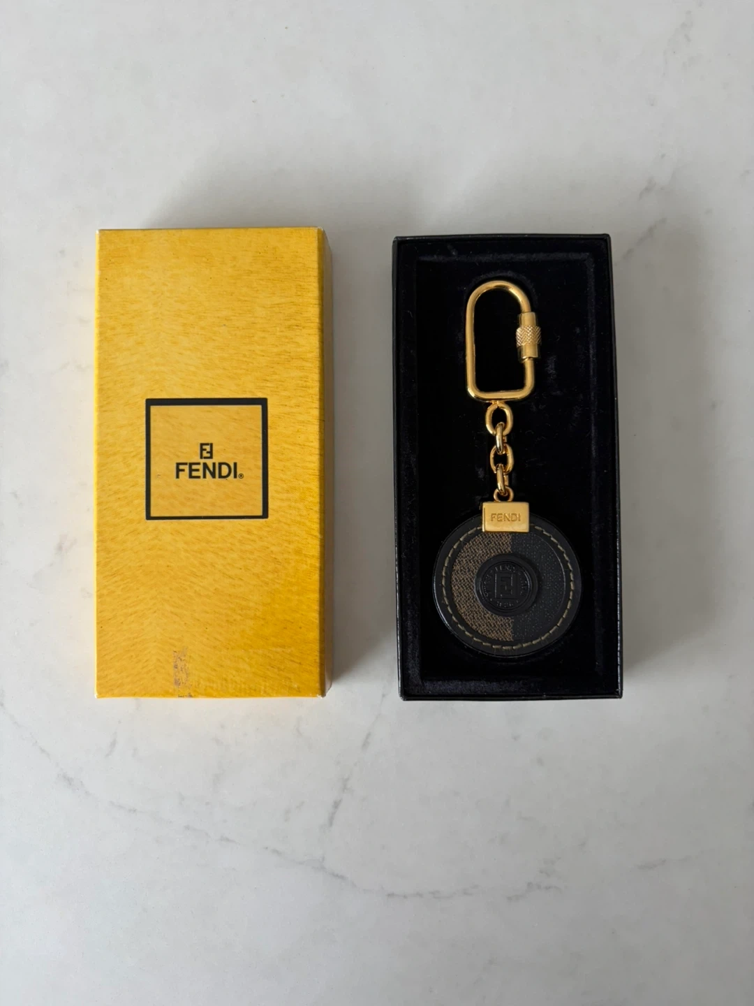 This Fendi keychain features the brand's iconic pattern. It has a gold-tone clasp and chain. Comes with original box.